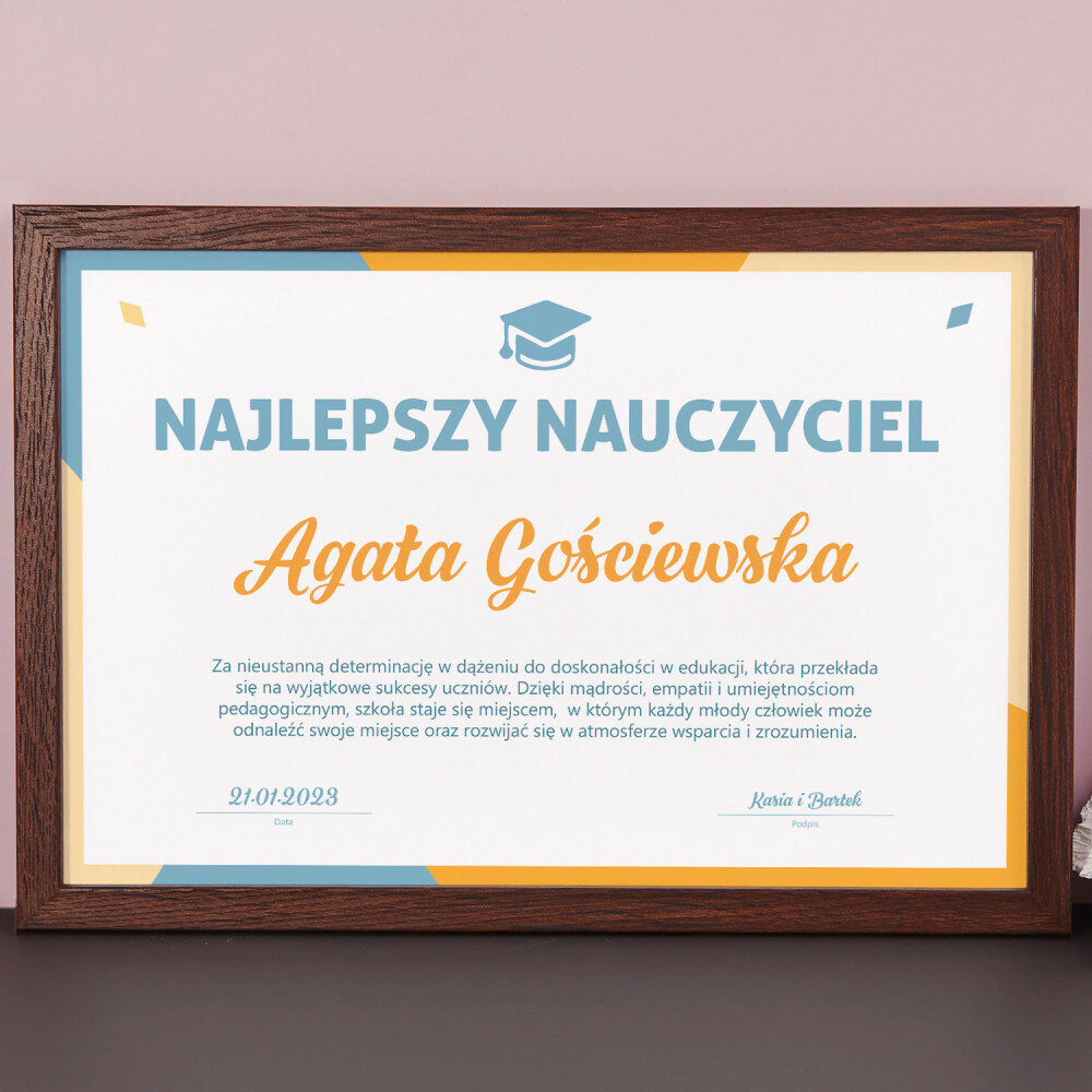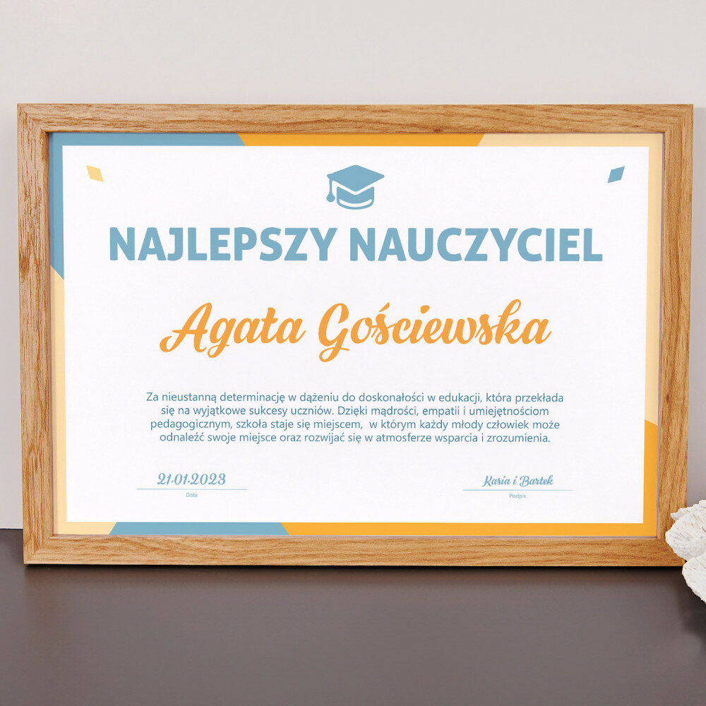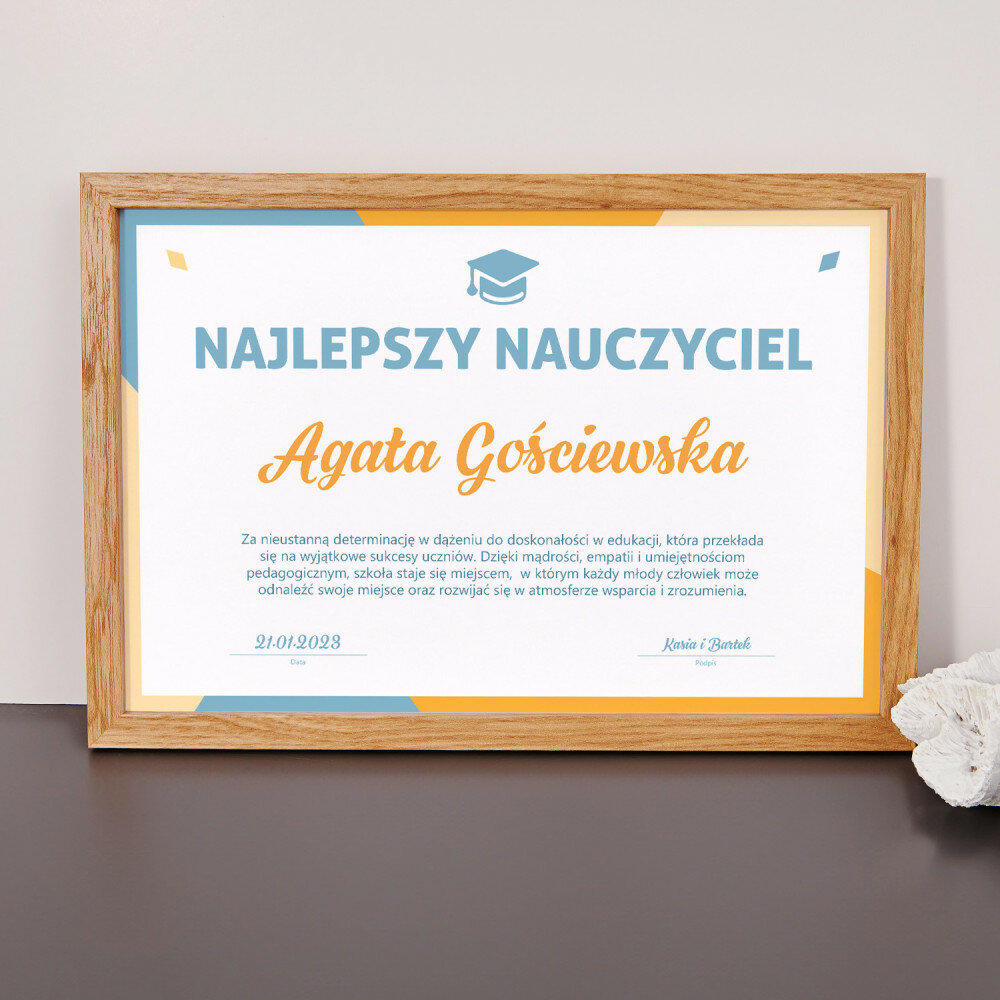 Po uzupełnieniu personalizacji i zamówieniu produktu, projekt przesyłamy do realizacji.Jeśli zamówienie zostanie złożone do godziny 16:00, certyfikat zostanie wysłany do Ciebie tego samego dnia. Jeśli zamówienie będzie po godzinie 16:00, wysyłka zostanie zrealizowana następnego dnia roboczego. Po otrzymaniu od kuriera certyfikatu możesz go wręczyć komuś bliskiemu lub zawiesić na ścianie.