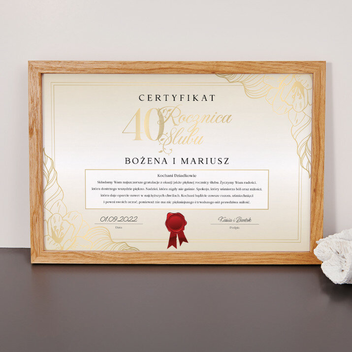 Certyfikat wydrukowany jest na wysokiej jakości papierze fotograficznym w formacie 20 x 30 cm. Finalnie Certyfikat oprawiony jest w elegancką ramkę z płyty MDF w formacie 20x30cm. Oferujemy opcję wyboru jasnej lub ciemniejszej ramki, dostosowanej do indywidualnych preferencji, aby podkreślić wartość i znaczenie certyfikatu.CZAS REALIZACJI