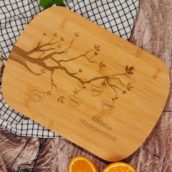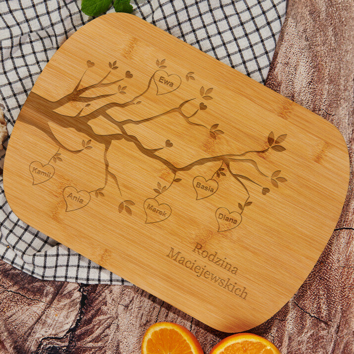 To nie jest zwykła deska do krojenia! To deska nasączona rodzinną historią, przedstawiająca efektowne drzewo rodzinne ze wszystkimi gałęziami. Idealna na prezent dla rodziców lub dziadków!Możliwość personalizacji - imion oraz nazwiska na desce.