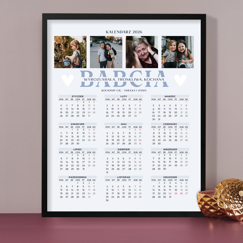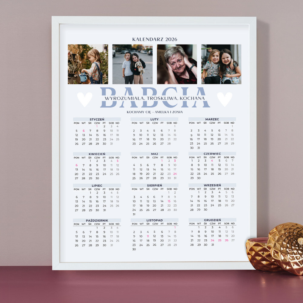 Personalizowany kalendarz oprawiony w ramkę to świetny pomysł na prezent, który idealnie sprawdzi się w każdym wnętrzu! Cały rok został umieszczony na jednej stronie, dzięki czemu od razu widoczny jest układ wszystkich miesięcy. Nadruk wykonany na papierze foto wygląda pięknie, kolory są nasycone, a efekt trwały. Jest to idealny upominek i pamiątka w jednym!Wymiary: 40 x 50 cm