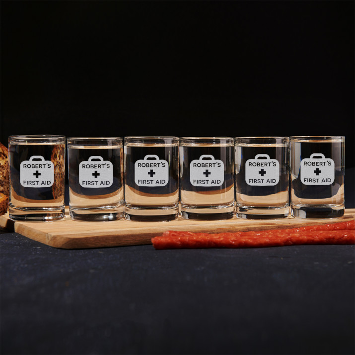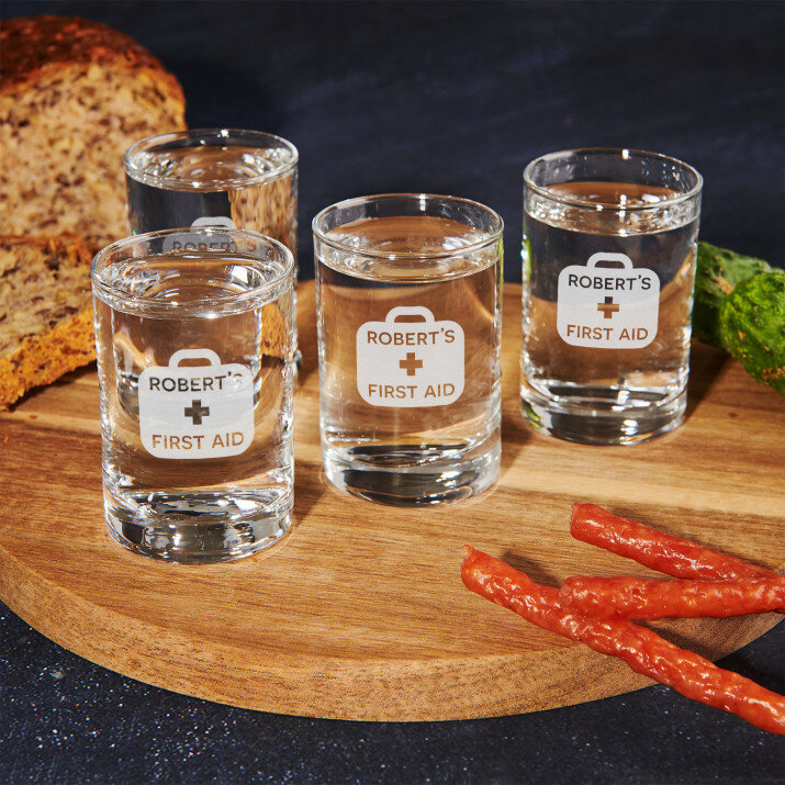Te kieliszki do wódki z napisem 'First Aid' to zabawny i oryginalny prezent dla miłośników mocniejszych trunków. Świetna jakość i pomysł na humor.