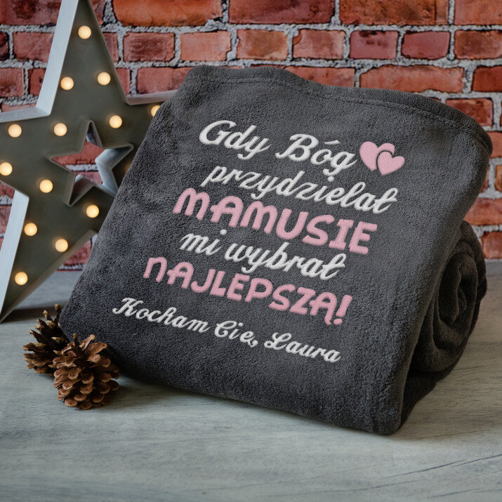 Koc o wymiarach 140 x 200 cm w kolorze szarym lub różowym, wykonany z wysokogatunkowego polaru, charakteryzuje się niepowtarzalną puszystością i miękkością, ozdobiony jednym z naszych personalizowanych haftowanych wzorów.