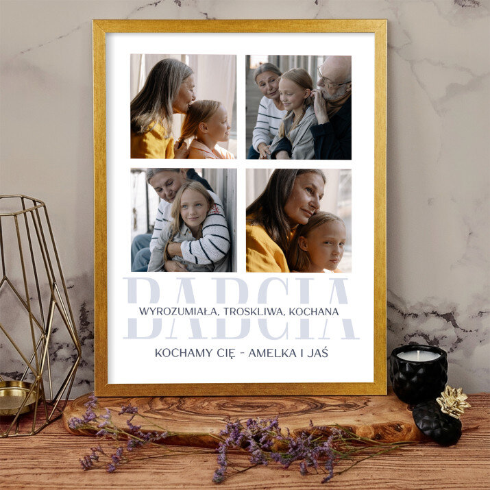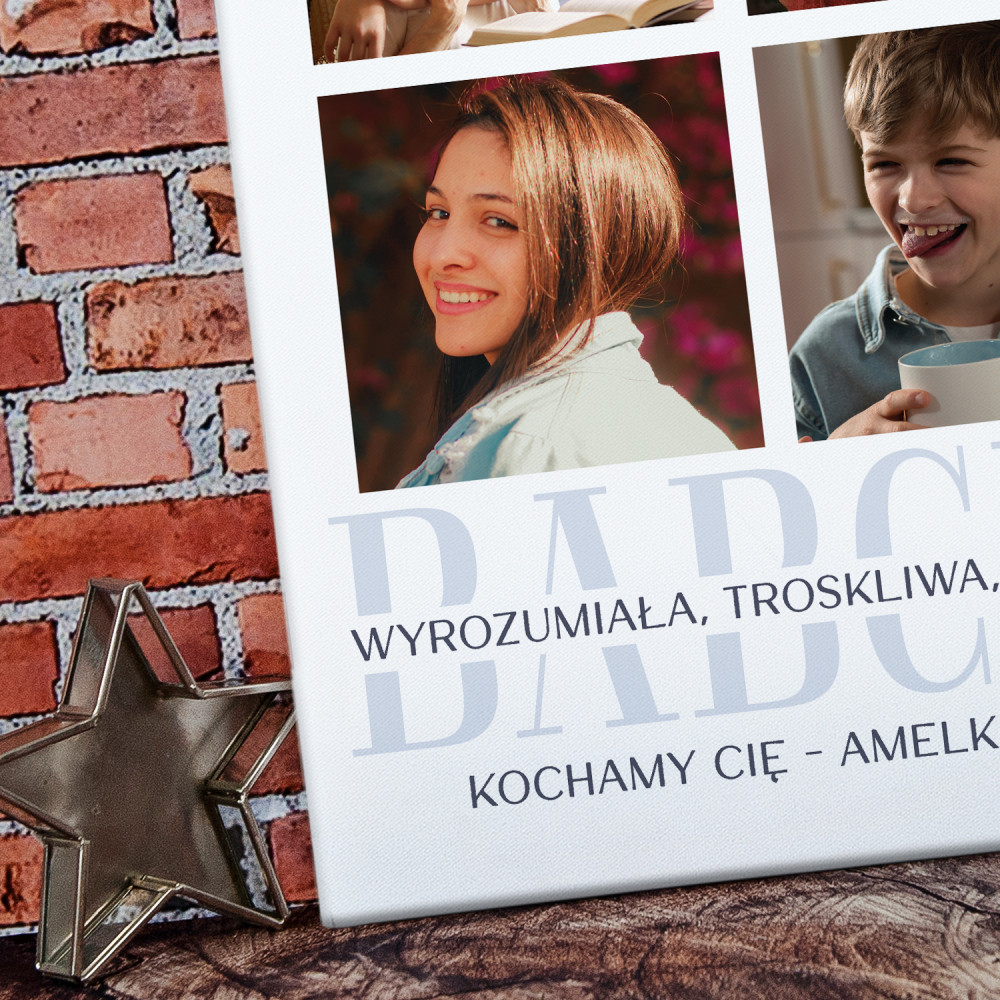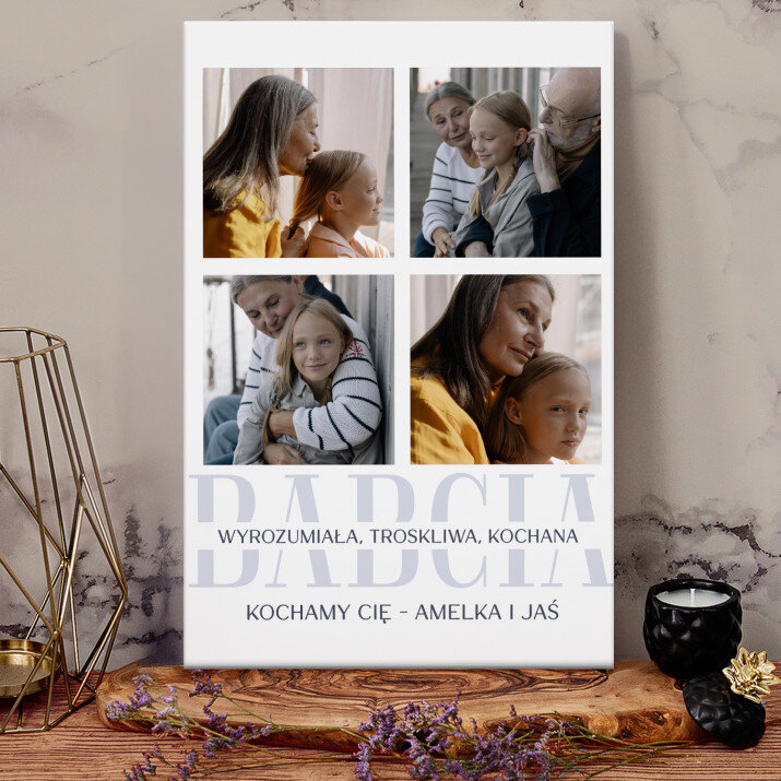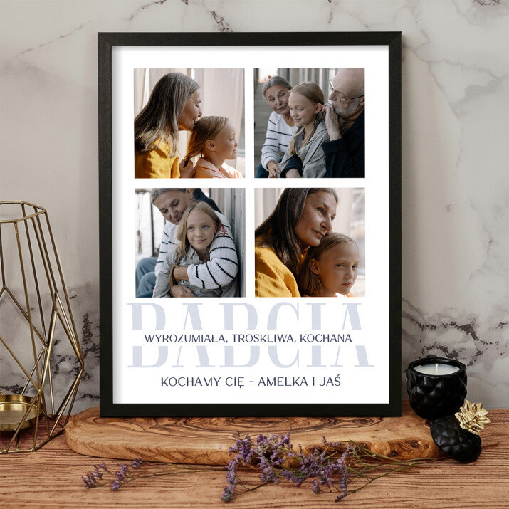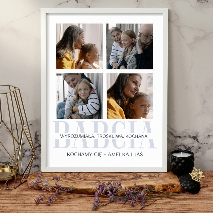 Piękna kompozycja Twoich zdjęć z kilkoma słowami prosto z serca oraz podpisami. Idealny prezent dla tych, z którymi łączy Cię mnóstwo wspomnień. Wystarczy wybrać ulubione fotografie najważniejszych dla Was chwil, a powstanie pamiątka, która zostanie z obdarowaną osobą na zawsze. To również niezwykle oryginalna i efektowna dekoracja do mieszkania.