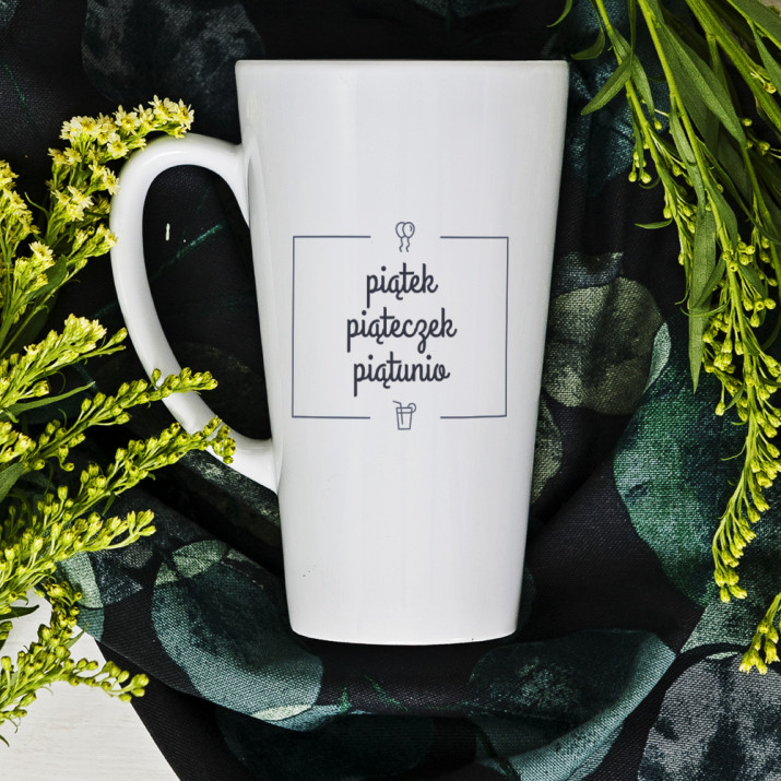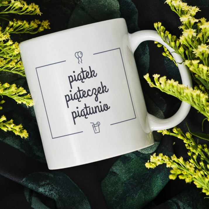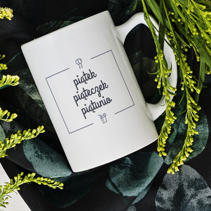 Idealny kubek na piątek – pijąc w nim kawę czy herbatę czas w pracy płynie jeszcze szybciej niż zwykle! Ani się obejrzysz, a już wybije godzina 16-sta i rozpocznie się upragniony weekend!Wykonanie
