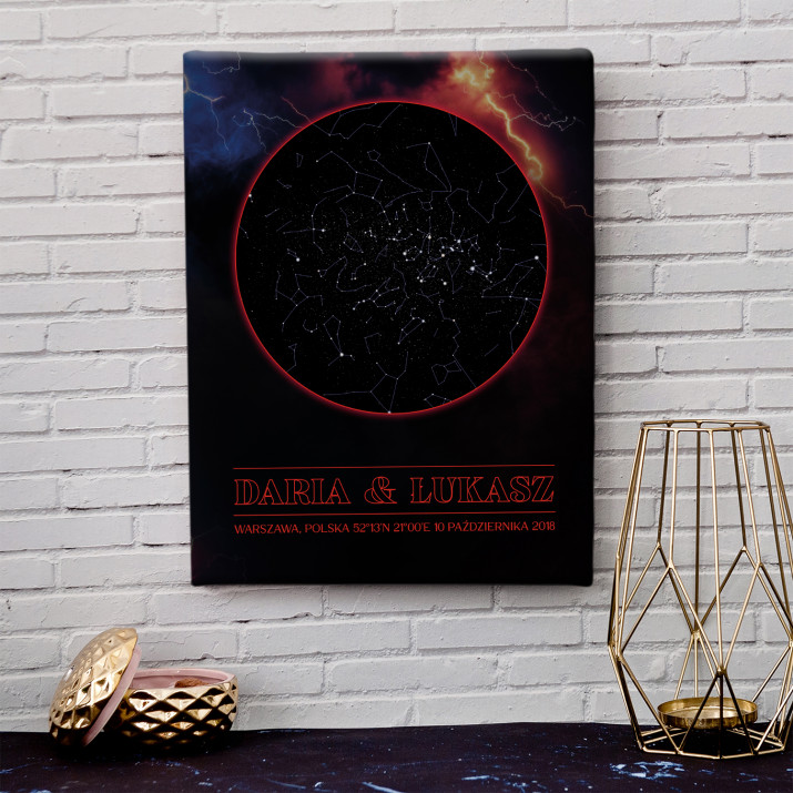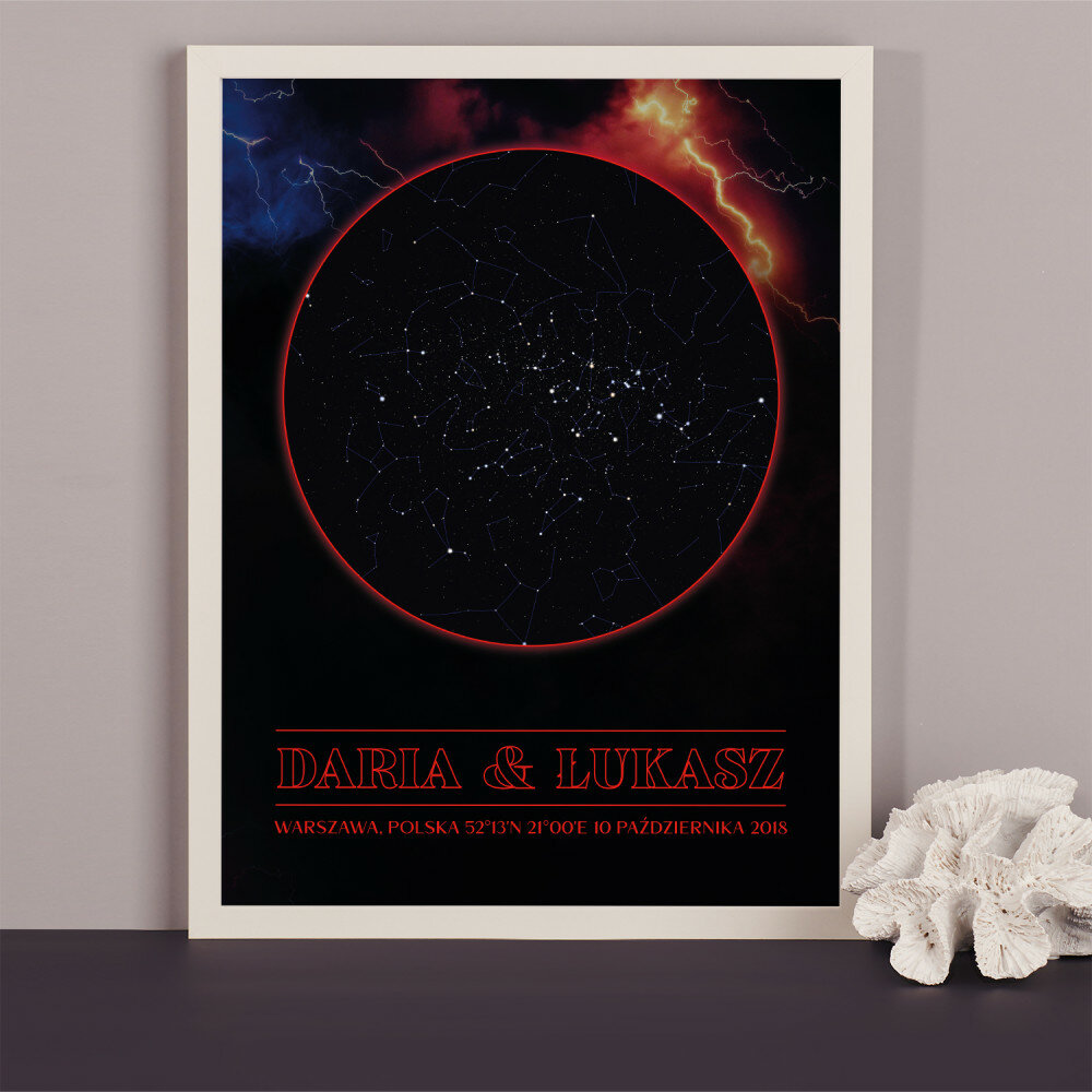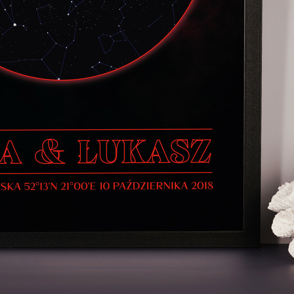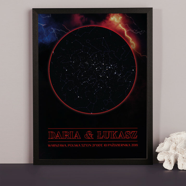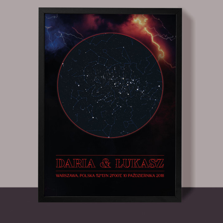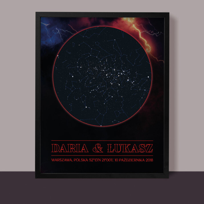 Wyjątkowy plakat w ramce lub obraz na płótnie to piękna i oryginalna pamiątka ważnego dla Ciebie momentu. Podanie wybranego miasta i daty pozwala odtworzyć wygląd nieba i układ gwiazd z tego dnia. Personalizacja obejmuje także podane przez Ciebie imiona, dedykację i inne elementy, dzięki którym taki wydruk stanie się bardzo osobistym i niepowtarzalnym podarunkiem.PERSONALIZACJA