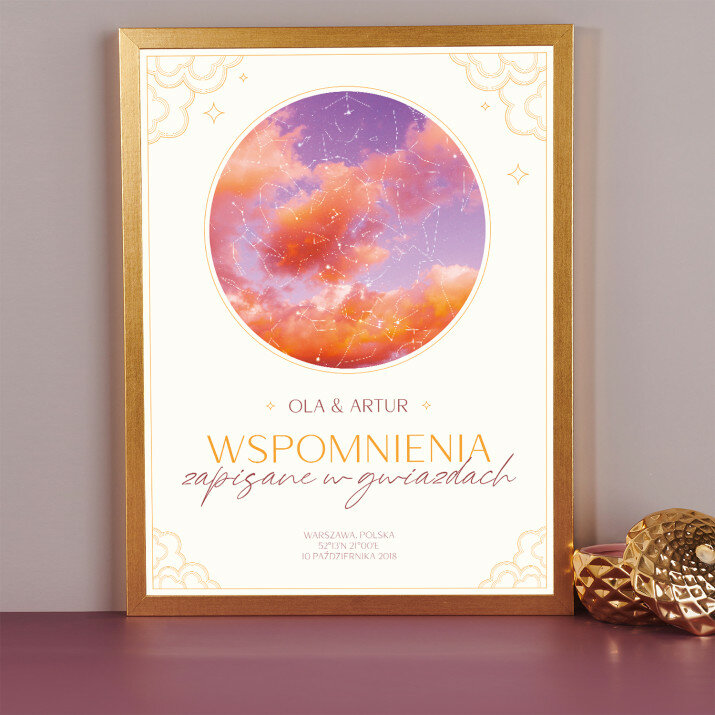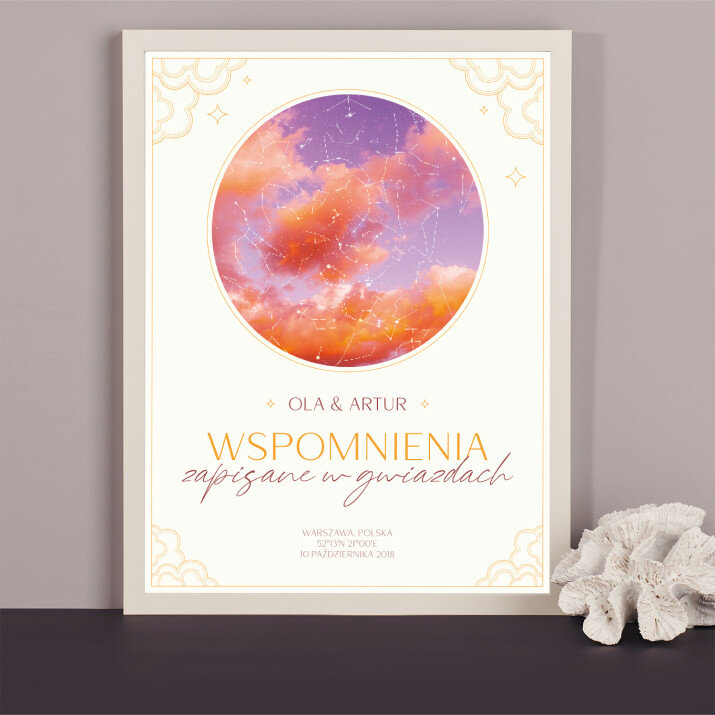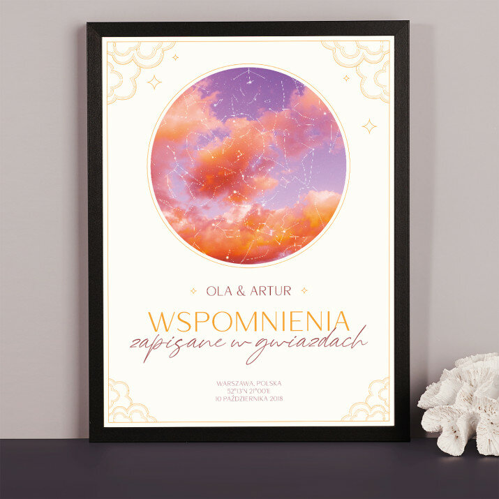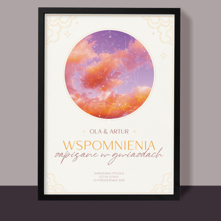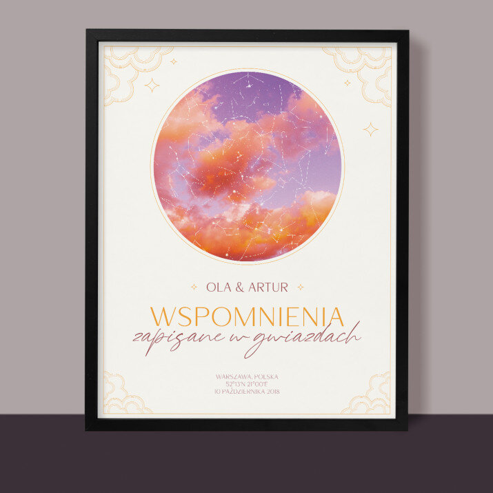 Wyjątkowy plakat w ramce lub obraz na płótnie to piękna i oryginalna pamiątka ważnego dla Ciebie momentu. Podanie wybranego miasta i daty pozwala odtworzyć wygląd nieba i układ gwiazd z tego dnia. Personalizacja obejmuje także podane przez Ciebie imiona, dedykację i inne elementy, dzięki którym taki wydruk stanie się bardzo osobistym i niepowtarzalnym podarunkiem.PERSONALIZACJA