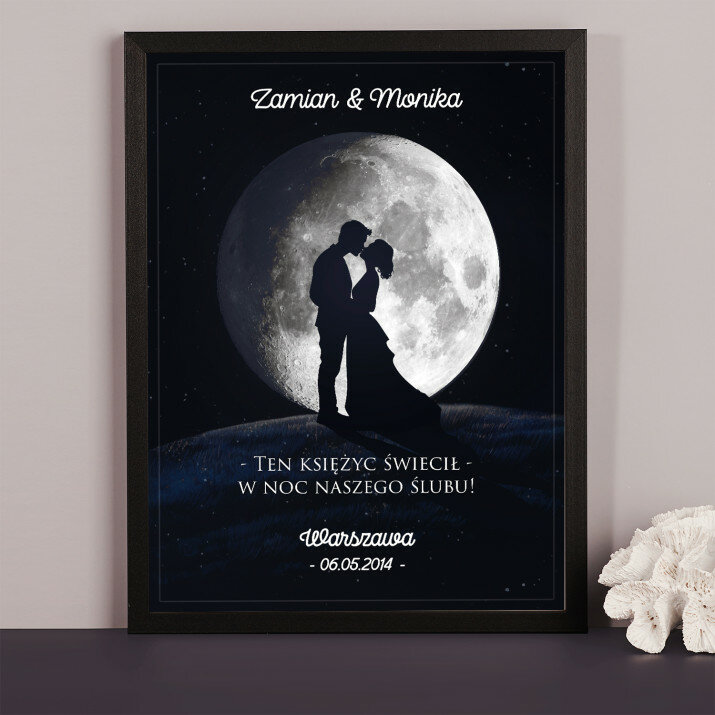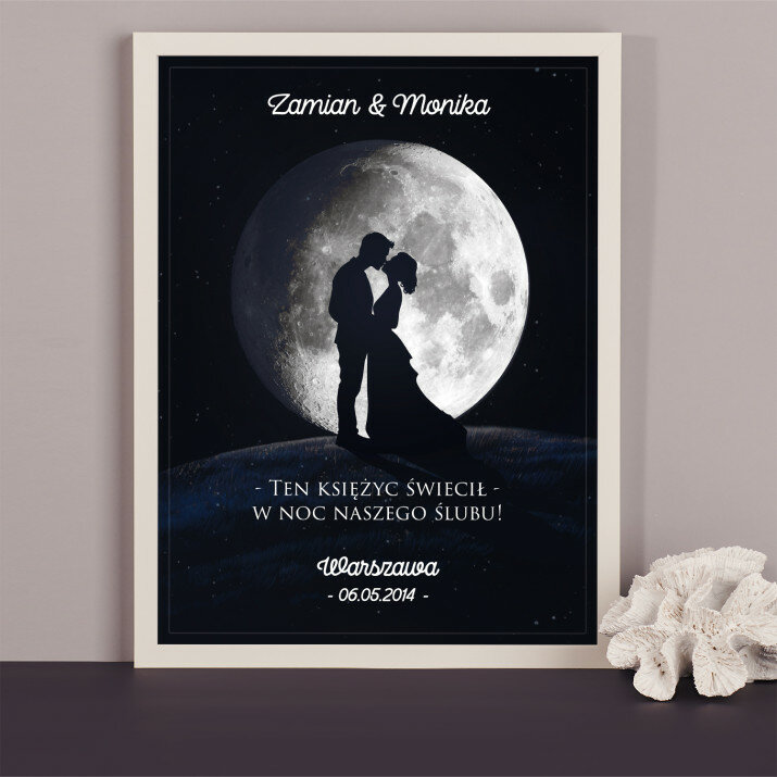 Wyjątkowy plakat z mapą księżyca w ramce to piękna i oryginalna pamiątka ważnego dla Ciebie momentu. Podanie wybranego miasta i daty pozwala odtworzyć wygląd księżyca z tego dnia. Personalizacja obejmuje także podane przez Ciebie imiona oraz dedykację, dzięki którym taki wydruk stanie się bardzo osobistym i niepowtarzalnym podarunkiem. Dodatkowe informacje:Końcowy produkt to wydruk plakatu na papierze fotograficznym obramowany w ramkę 30 x 40 cm w jednym z trzech kolorów do wyboru: czarnym, białym lub złotym