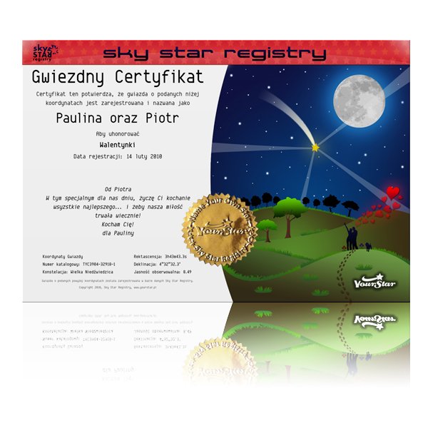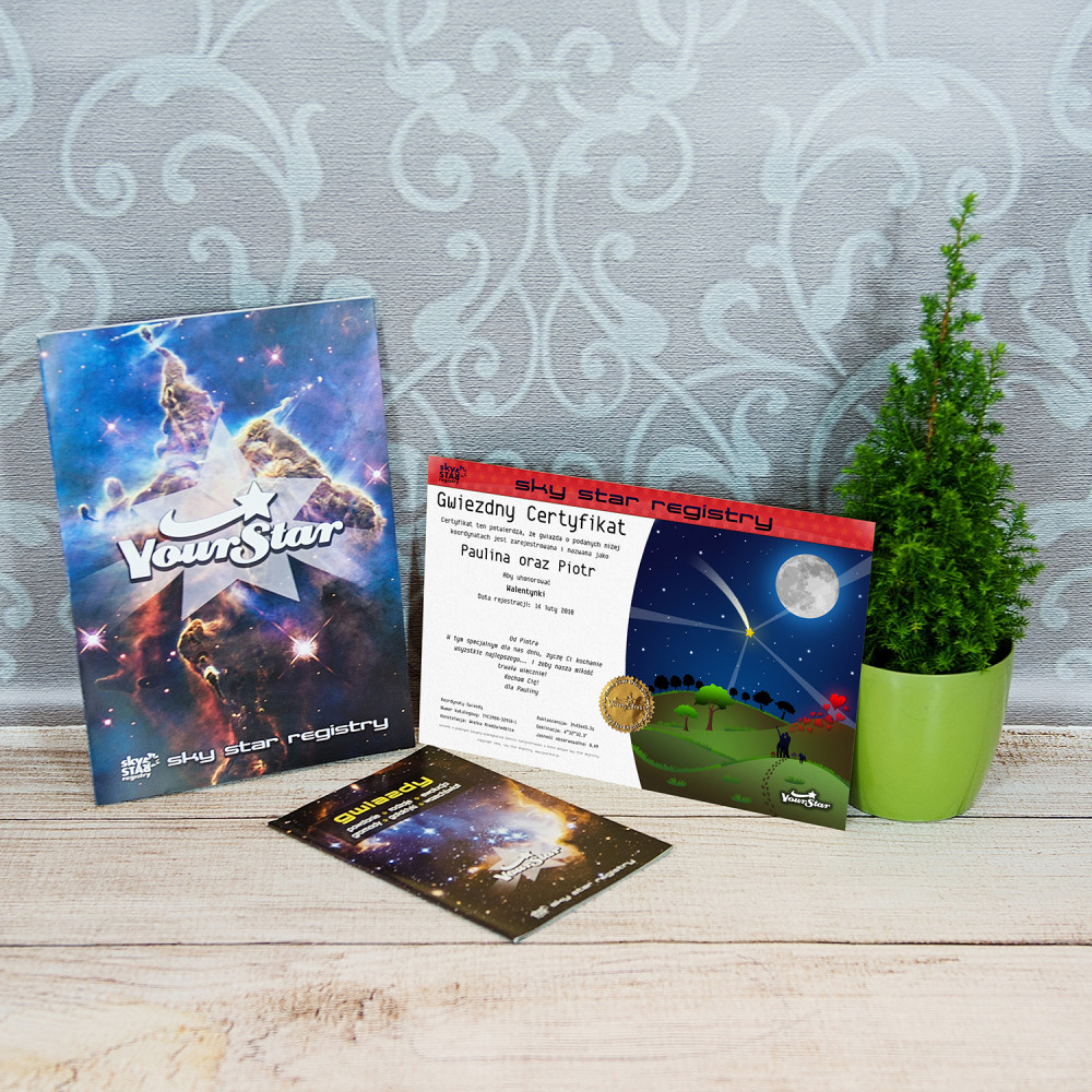 - Spersonalizowany Gwiezdny Certyfikat o wymiarach 20x30 cm, z nazwą oraz koordynatami gwiazdy.