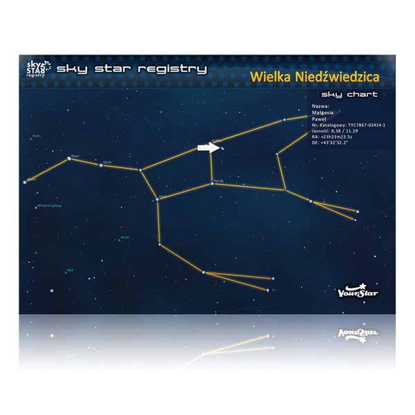 - Sky Chart o wymiarach 20x30cm, pokazujący położenie gwiazdy w ramach wybranej konstelacji.