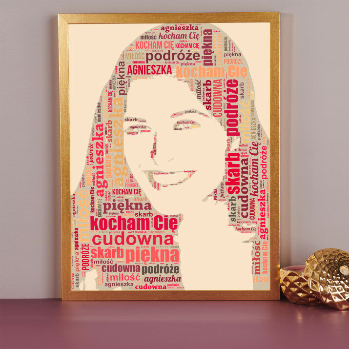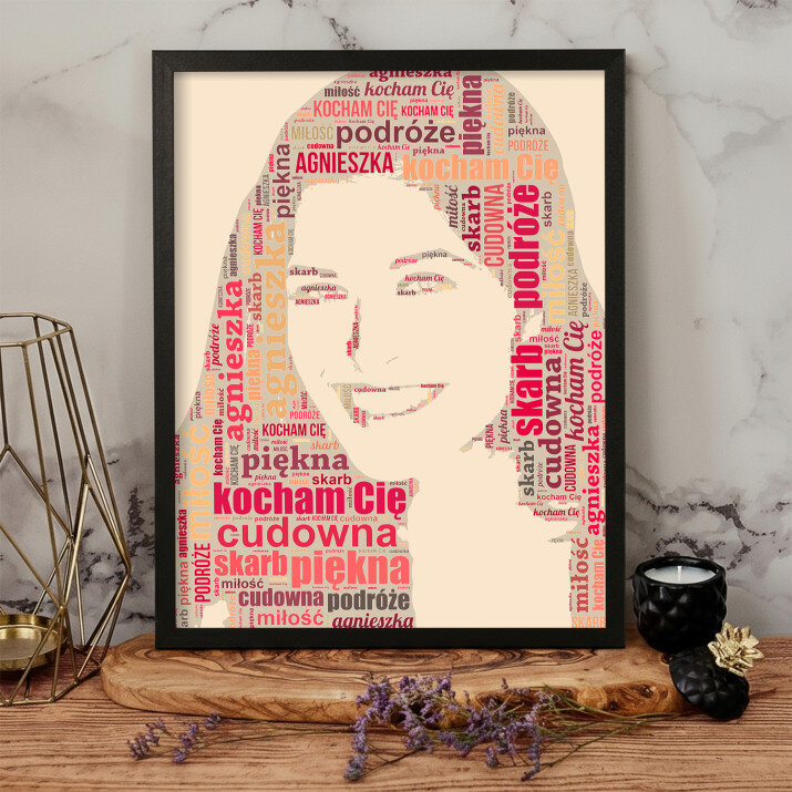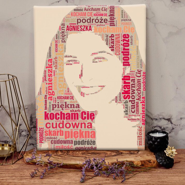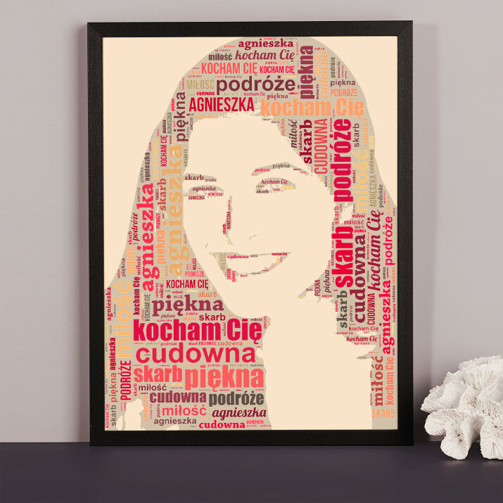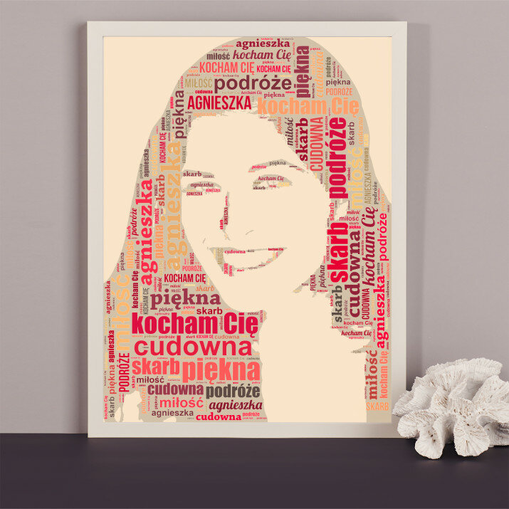 Obraz Chmura Słów pokaże Twoje zdjęcie ze słów, które nam prześlesz. Całkowicie unikalne spojrzenie na zdjęcie stworzy obraz, który zaskoczy oglądających.STYLOWY PORTRET