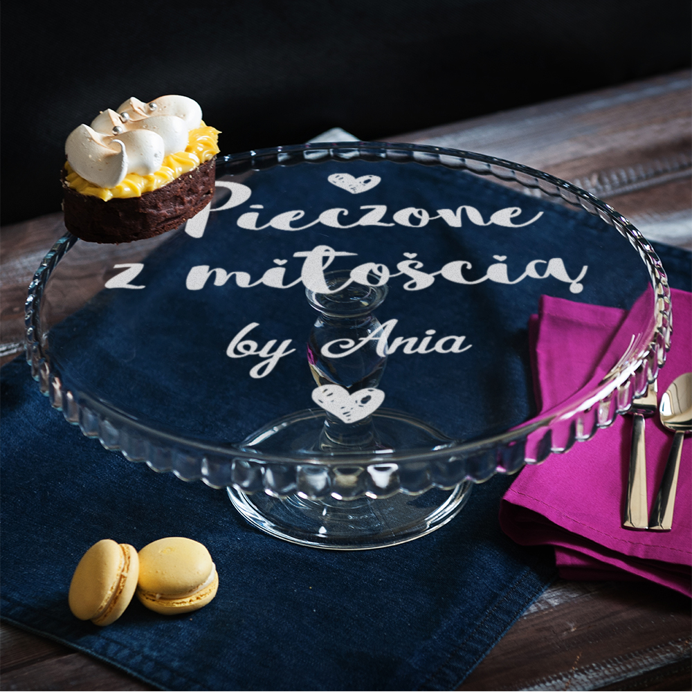 Okrągła patera na nóżce wykonana jest z bezbarwnego szkła, które jest 2-3 razy bardziej odporne na uszkodzenia niż porcelitowe czy porcelanowe produkty o podobnej grubości. Powierzchnia patery jest idealnie gładka. Grawerujemy całą powierzchnię produktu!Wymiary: