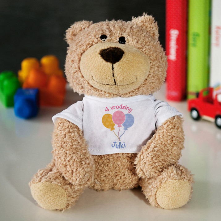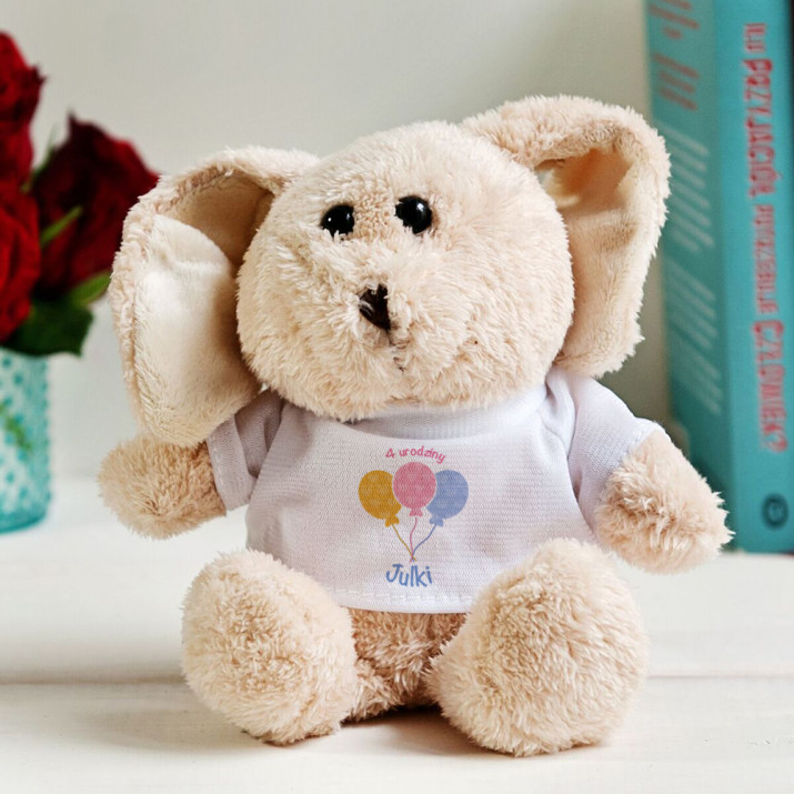 Śliczna maskotka w koszulce z wybranym przez Ciebie napisem to wyjątkowy prezent, który sprawi mnóstwo radości tym młodszym solenizantom i zaskoczy tych trochę starszych!Wykonanie