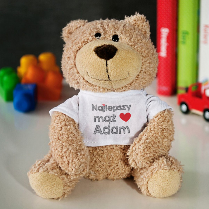 Twój mąż jest najlepszym miśkiem? Stwórz jego mini wersję w postaci prawdziwego pluszaka ubranego w koszulkę z jego imieniem! Uroczy prezent z okazji rocznicy, urodzin czy każdej innej okazji!Wykonanie