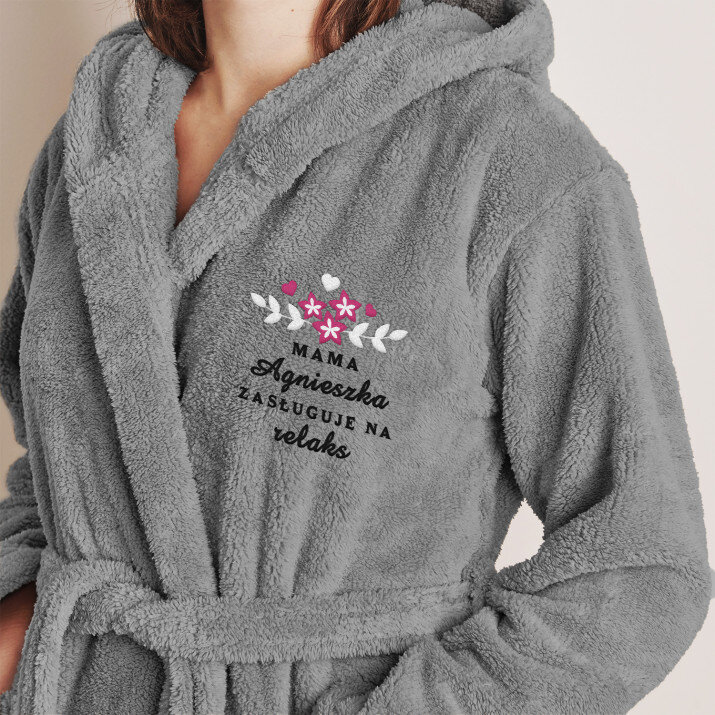 Uniwersalny szlafrok polarowy w kolorze szarym, wykonany ze 100% poliestru wellsoft. Wygodny, ładny, mięciutki - zapewni doskonały komfort, gdy wszystkie troski dnia odejdą w dal i nadejdzie czas na relaks. Ogrzeje również zaspane ciałko zaraz po przebudzeniu. Szlafrok ozdobiony jest personalizowanym haftem, który pięknie wygląda, poprawia samopoczucie i zamienia produkt w wyjątkowy upominek!Szlafrok ma elegancki fason z kapturem i kieszeniami, aby można było zabłysnąć na wieczornym pokazie mody podomowej. Rozmiar szlafroka uniwersalny, gramatura 300 g/m2. Unisex.