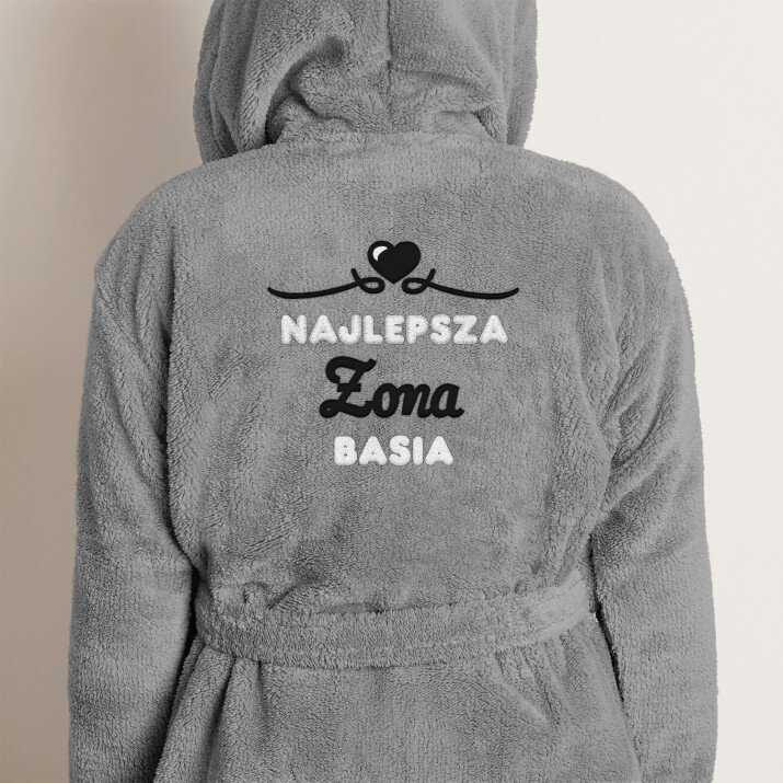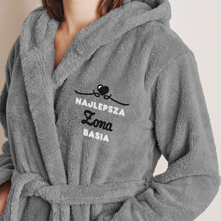 Uniwersalny szlafrok polarowy w kolorze szarym, wykonany ze 100% poliestru wellsoft. Wygodny, ładny, mięciutki - zapewni doskonały komfort, gdy wszystkie troski dnia odejdą w dal i nadejdzie czas na relaks. Ogrzeje również zaspane ciałko zaraz po przebudzeniu. Szlafrok ozdobiony jest personalizowanym haftem, który pięknie wygląda, poprawia samopoczucie i zamienia produkt w wyjątkowy upominek!Szlafrok ma elegancki fason z kapturem i kieszeniami, aby można było zabłysnąć na wieczornym pokazie mody podomowej. Rozmiar szlafroka uniwersalny, gramatura 300 g/m2. Unisex.