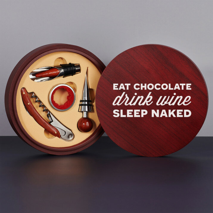 Ciekawy prezent dla koneserów dobrego wina i kilku innych, życiowych przyjemności! Trzy zabawne „przykazania” wygrawerowane na solidnym i eleganckim zestawie do wina.Wykonanie