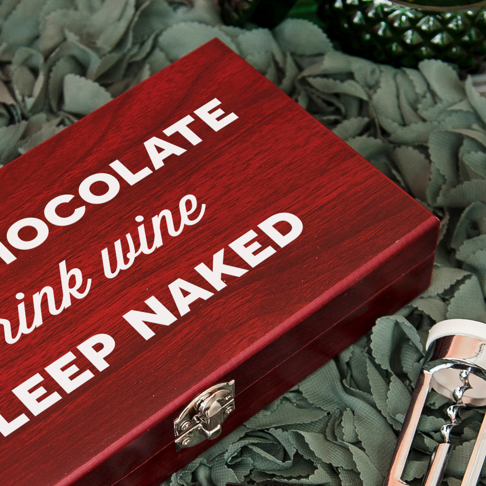 Piękny, czteroczęściowy zestaw do wina w eleganckim drewnianym pudełku z grawerem na pokrywce.Do wyboru są dwie wersje: