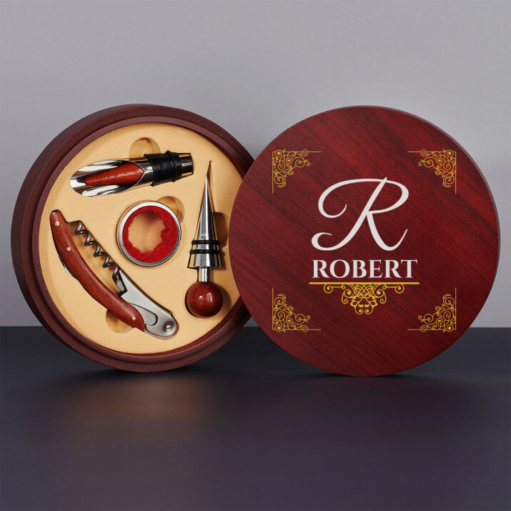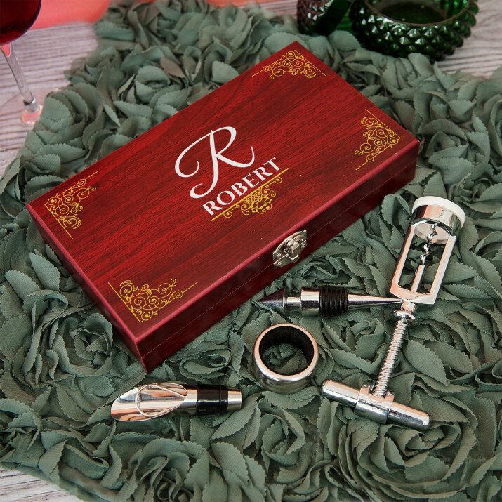 Piękny, czteroczęściowy zestaw do wina w eleganckim drewnianym pudełku z grawerem na pokrywce.