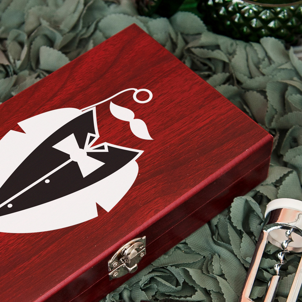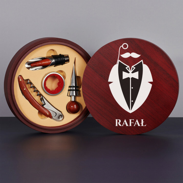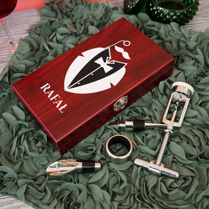 Piękny, czteroczęściowy zestaw do wina w eleganckim drewnianym pudełku z grawerem na pokrywce.