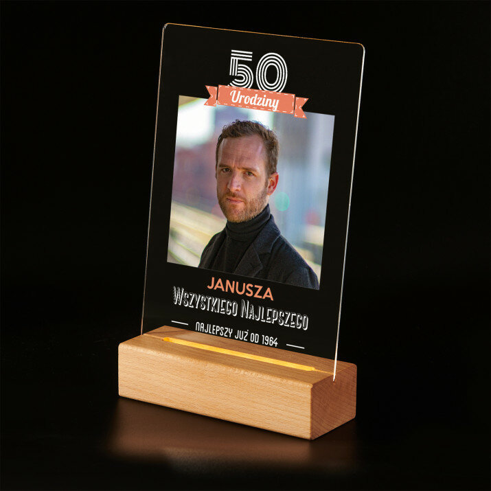 Wydruk na szkle akrylowym z podstawką drewnianą LED.