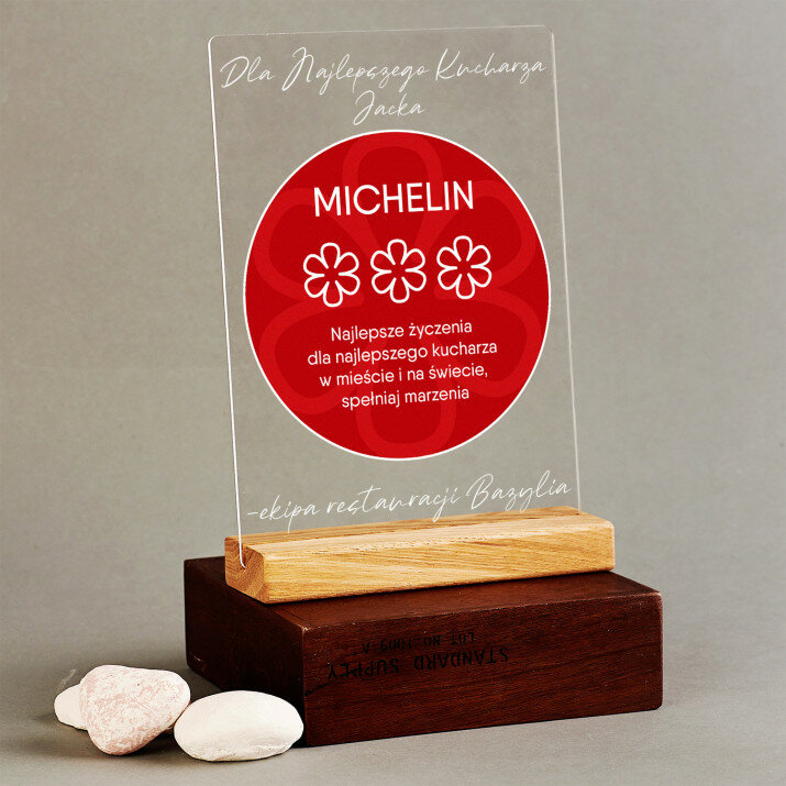 Wydruk na szkle akrylowym z podstawką drewnianą.