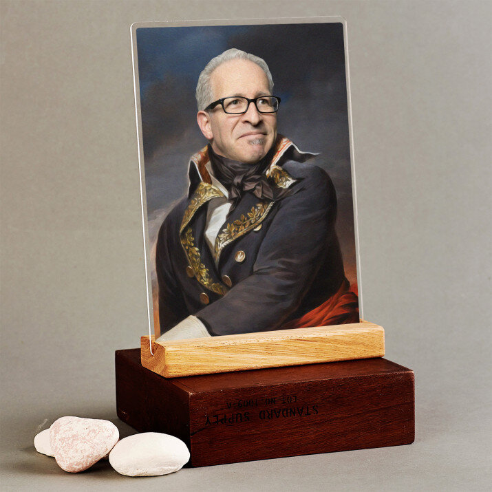 Wydruk na szkle akrylowym z podstawką drewnianą.