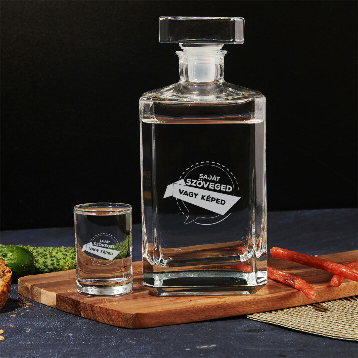 Zestaw z grawerowaną karafką i 6 kieliszkami do wódkiKarafka została wykonana z wysokiej jakości przezroczystego szkła. Prosta forma i eleganckie wykończenie sprawiają, że produkt będzie się elegancko prezentował w każdym barku. Kwadratowy kształt załamuje światło, które pięknie wydobywa barwę trunku. Pojemność karafki to 700 ml, wysokość 19,5 cm, a szerokość 8,5 cm.