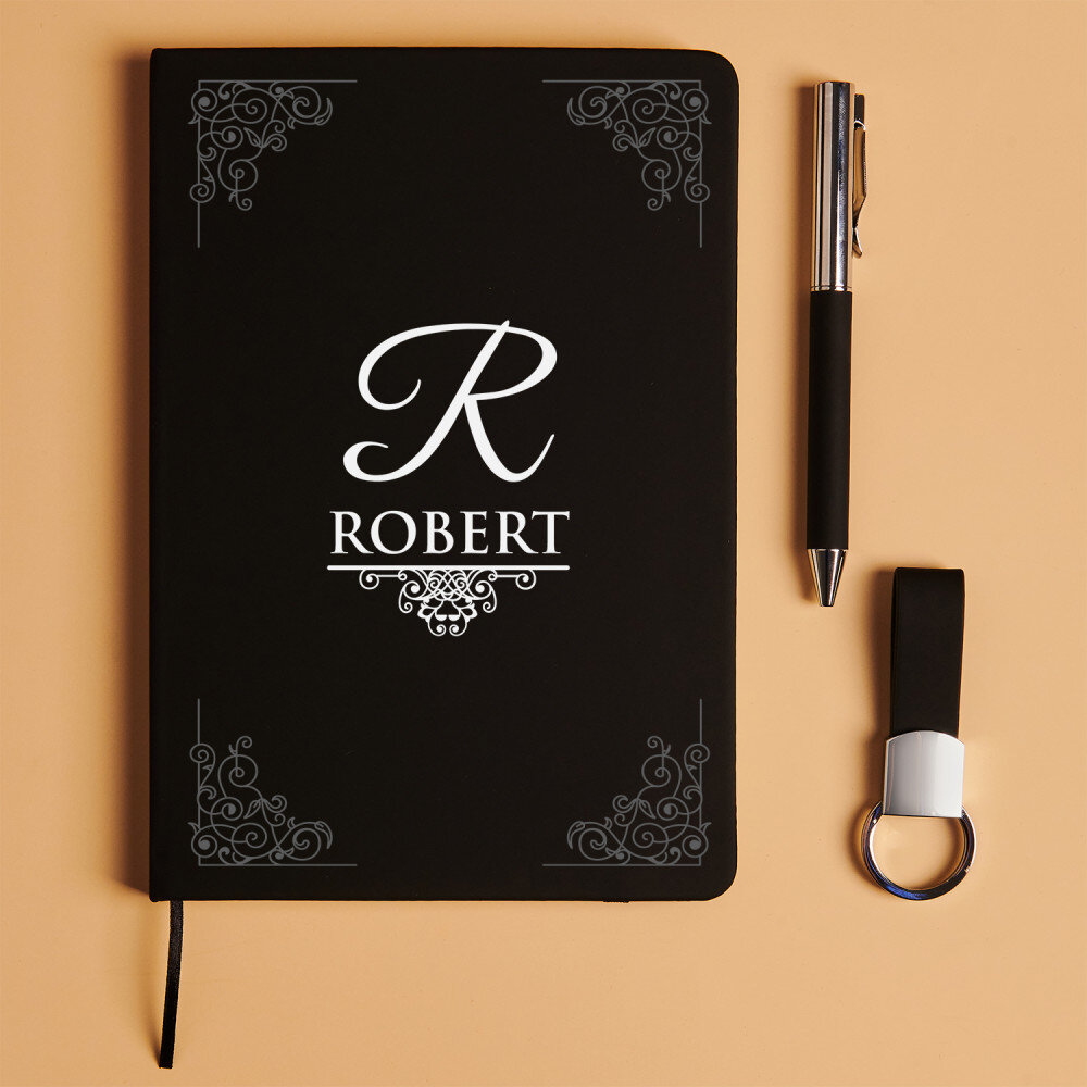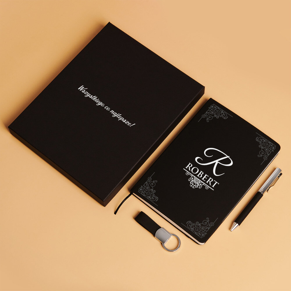 Zestaw z eleganckim notatnikiem z wybraną personalizacją.
