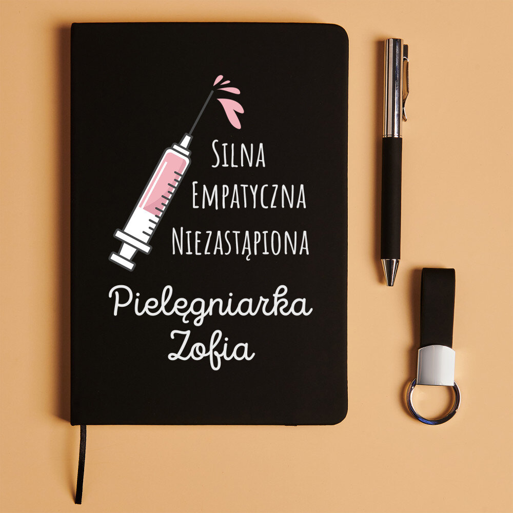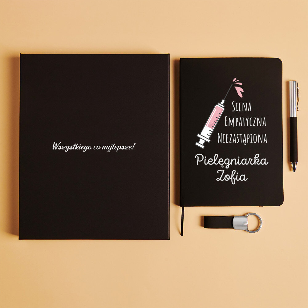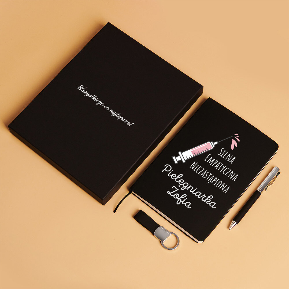 Zestaw z eleganckim notatnikiem z wybraną personalizacją.