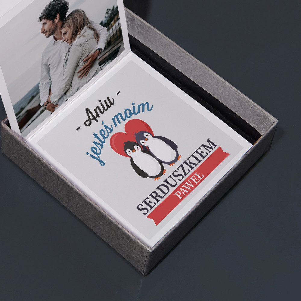 Twoje zdjęcia zostaną wydrukowane w technologii cyfrowej na wysokiej jakości papierze o gramaturze 300 g/m2. Nadruk wygląda pięknie, kolory są nasycone, efekt trwały. Ułożoną w harmonijkę kompozycję fotografii wklejamy do prezentowego pudełeczka o wymiarach 86 x 86 x 26 mm.Harmonijka składa się z trzech zdjęć o wymiarach 6,68 x 6,68 cm oraz spersonalizowanej kartki z wybranym przez Ciebie wzorem. Wokół zdjęć znajduje się biała ramka. Wymiary każdej strony razem z ramką: 7,5 x 7,5 cm.