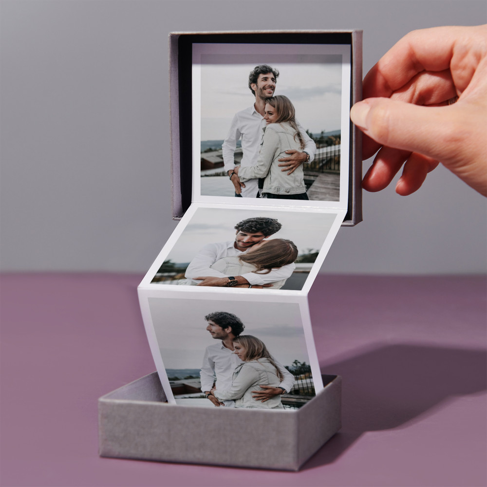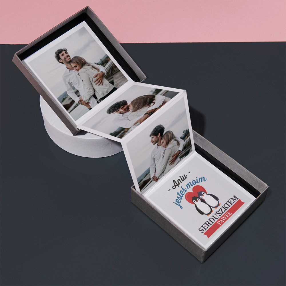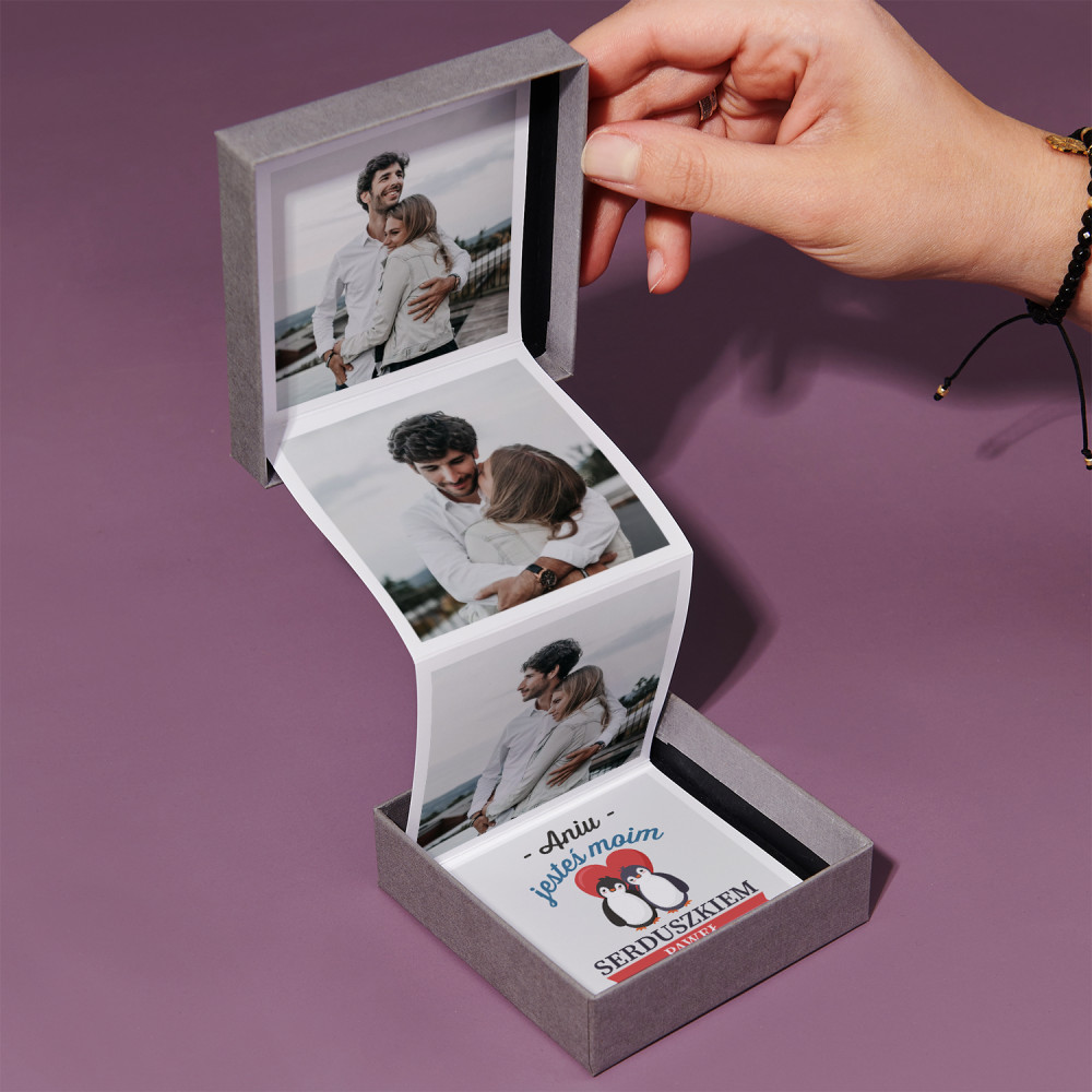Upominki ze zdjęciami zawsze się sprawdzają! Podarowanie takiej harmonijki sprawi radość bliskiej osobie, a przy okazji Wasze piękne chwile zostaną zamienione w pomysłową pamiątkę. Fotografie są estetycznie zapakowane w stylowym pudełeczku, dzięki czemu obdarowana osoba będzie mogła komfortowo zabrać je nawet w podróż dookoła świata! Do zdjęć dołączona jest jeszcze jedna karteczka z personalizowanym wzorem na specjalną okazję.WYKONANIE