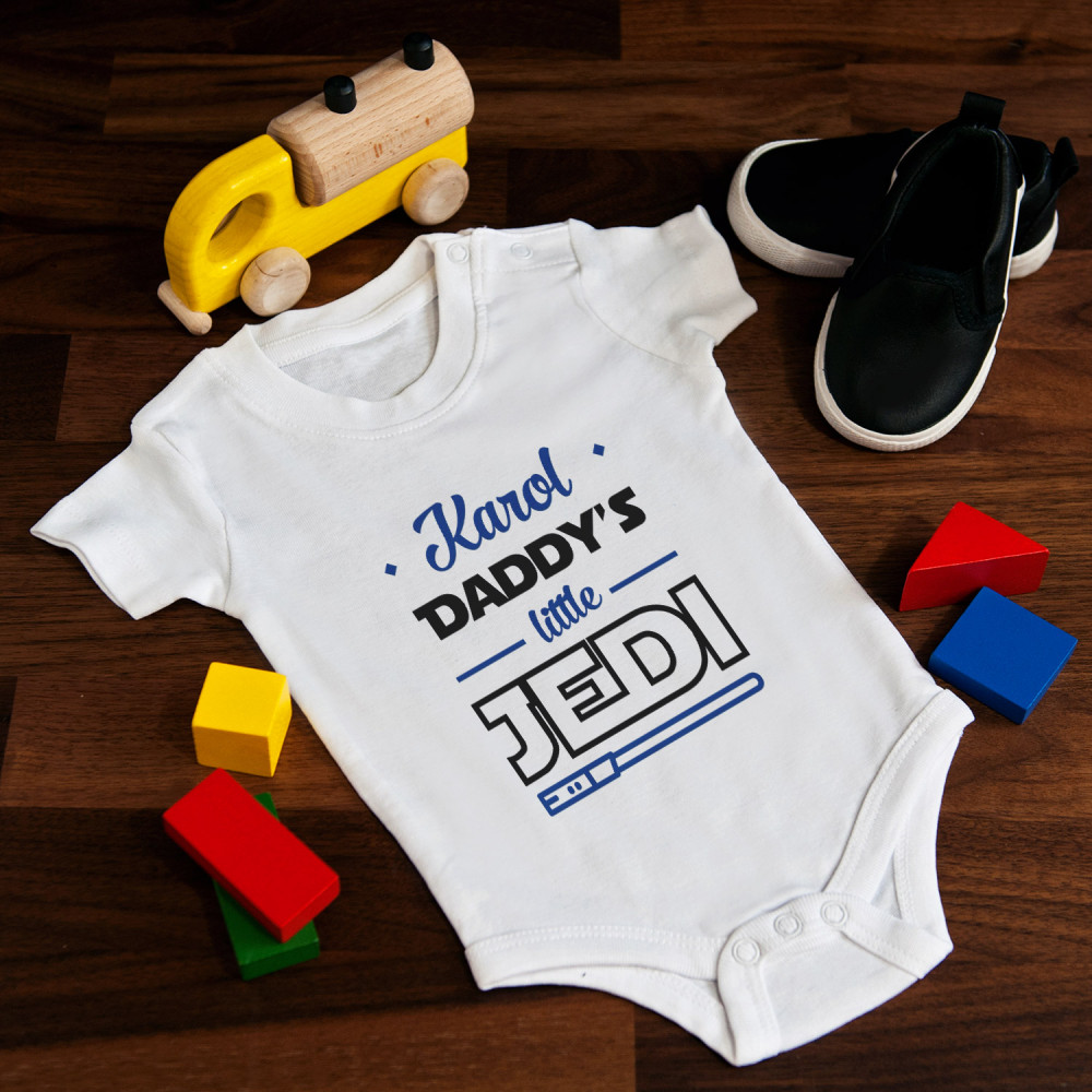 Body niemowlęce z krótkim rękawem w kolorze białym oraz z wyjątkowym kolorowym personalizowanym nadrukiem. Body ma zapięcia na ramionach i w kroku. Wykonane w 100% z bawełny, wykończone pod szyją lycrą. Dostępne w następujących rozmiarach:- 0-3 miesięcy
