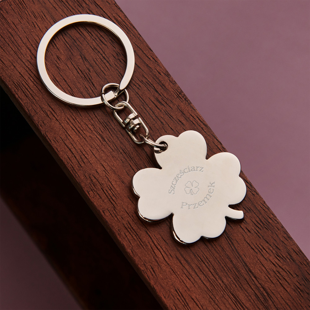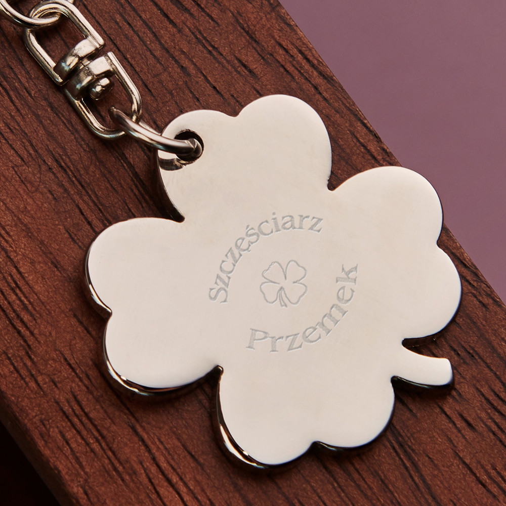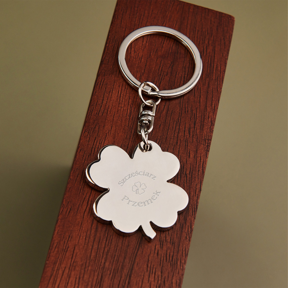 Srebrny brelok w kształcie czterolistnej koniczny wykonany jest z nierdzewnego i chromowanego metalu, dzięki czemu jest odporny na zarysowania. Można go przypiąć do plecaka, torebki lub portfela jako element ozdobny. Gadżet idealnie sprawdzi się również jako brelok do kluczy. Może stać się także talizmanem przynoszącym odrobinę szczęścia. Elegancki design sprawia, że całość przedstawia się niezwykle stylowo, wobec czego podarunek jest uniwersalny i można podarować go każdemu. Prezent idealny na wiele okazji. Na powierzchni produktu umieszczany jest personalizowany grawer!Wymiary: 35 x 38 x 3 mm