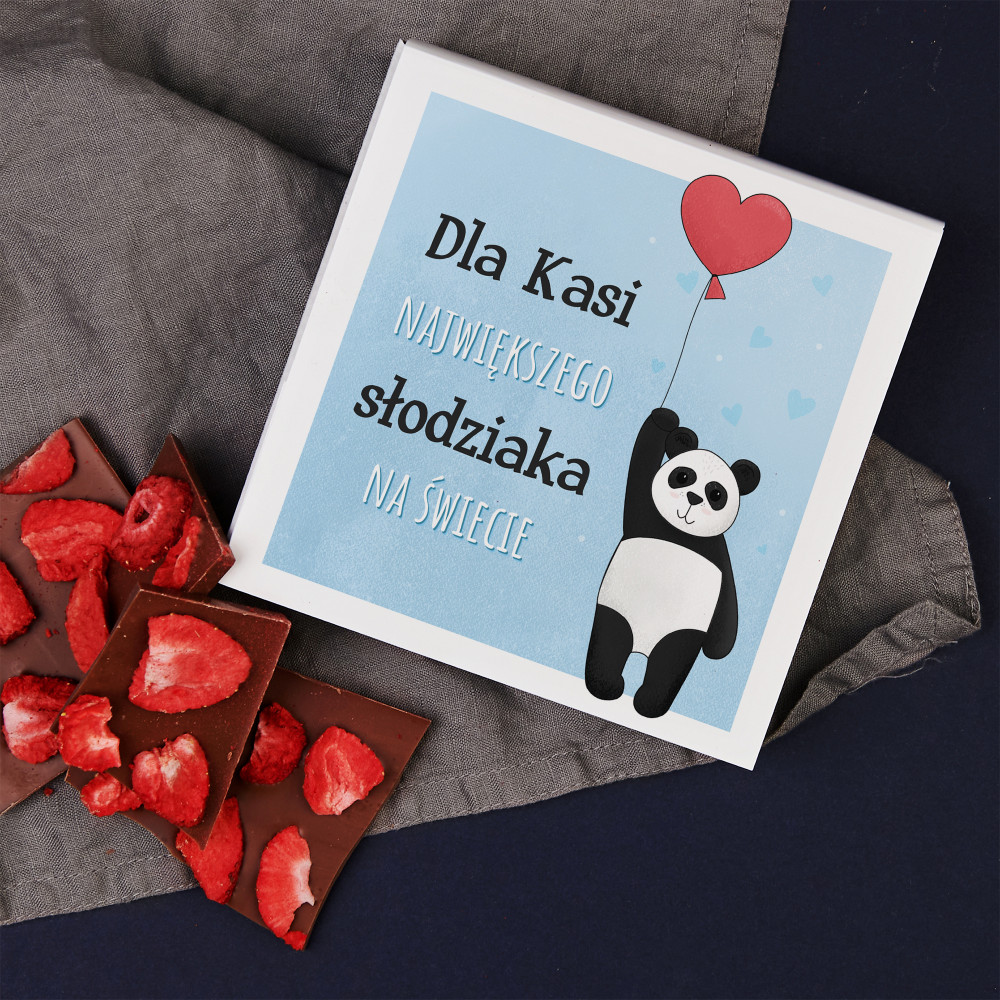 Mleczna czekolada z truskawkami to znakomity upominek na specjalne okazje. Dzięki personalizacji będzie ucztą nie tylko dla podniebienia, ale również dla oczu. Dobrze dobrany wzór to gwarancja prezentowego sukcesu, bo wiadomo, że czekoladę lubi każdy! Tabliczka czekolady zapakowana jest w wytrzymałe pudełko wypełnione dodatkowo ozdobnymi, papierowymi wiórkami. Personalizowany nadruk znajduje się na specjalnej obwolucie prezentowej.Szczegółowe informacje: