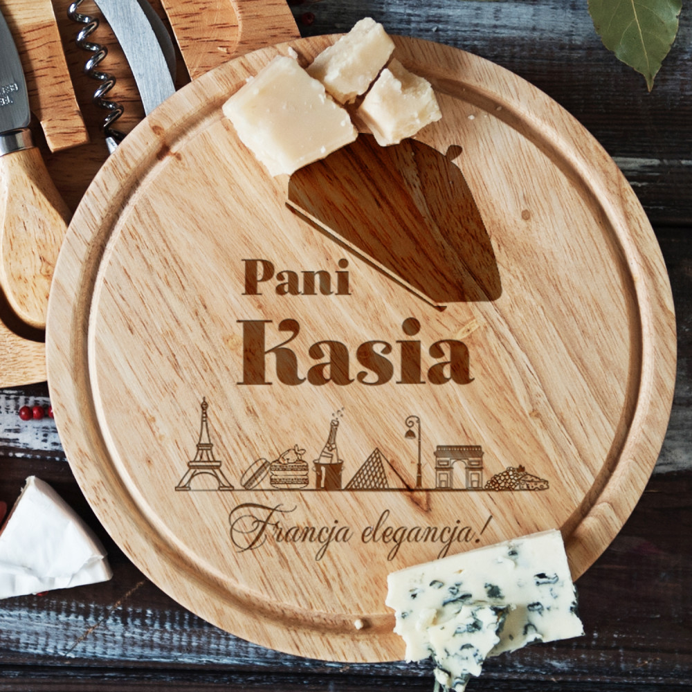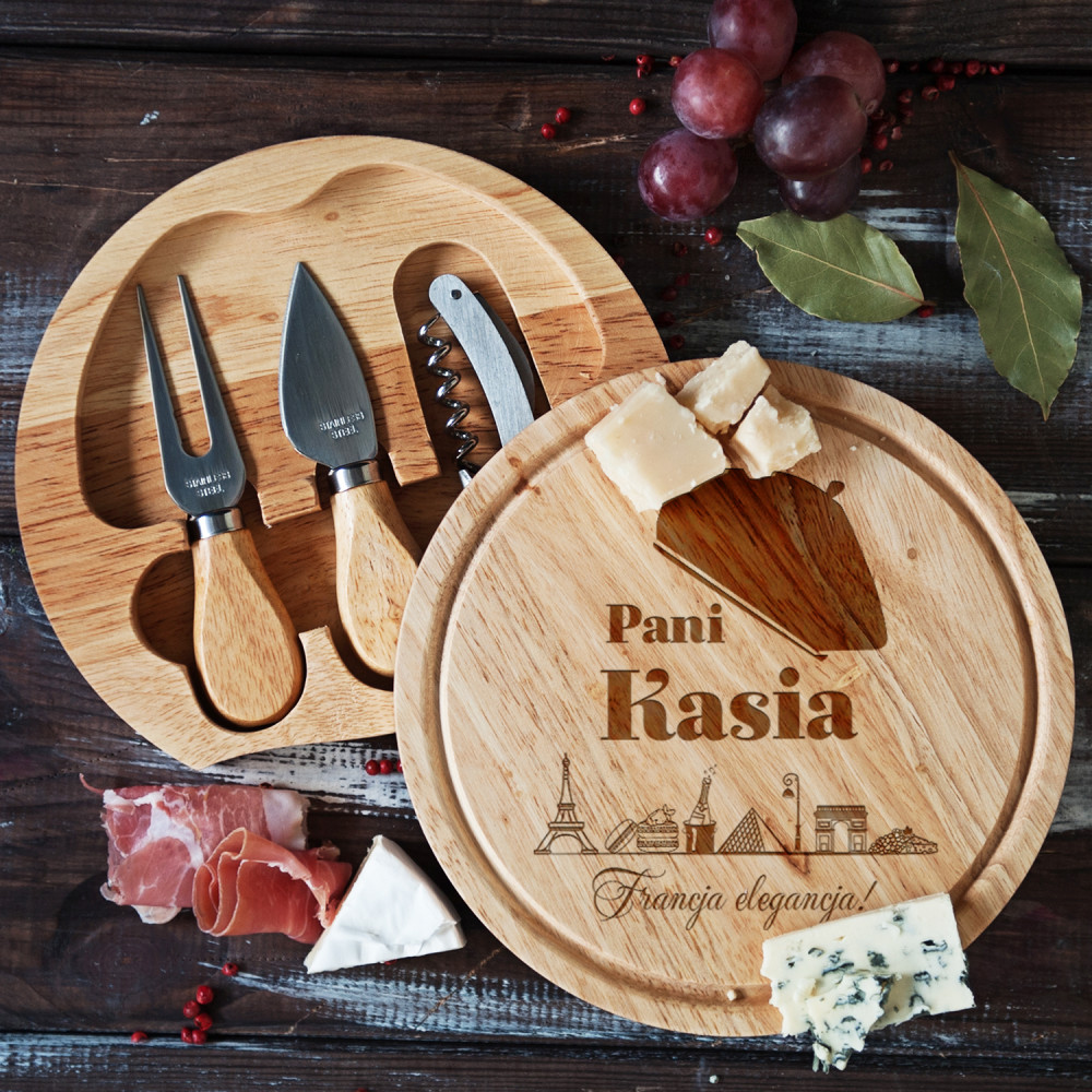 Wykonana z eleganckiego i wyszukanego drewna okrągła deska do sera. Deska jest jednocześnie pudełkiem na wykonany ze stali nierdzewnej zestaw niezbędnych akcesoriów, dzięki czemu wszystko jest zawsze w jednym miejscu. W skład zestawu wchodzi:- Drewniana deska (średnica 18,5 x 3,6 cm),