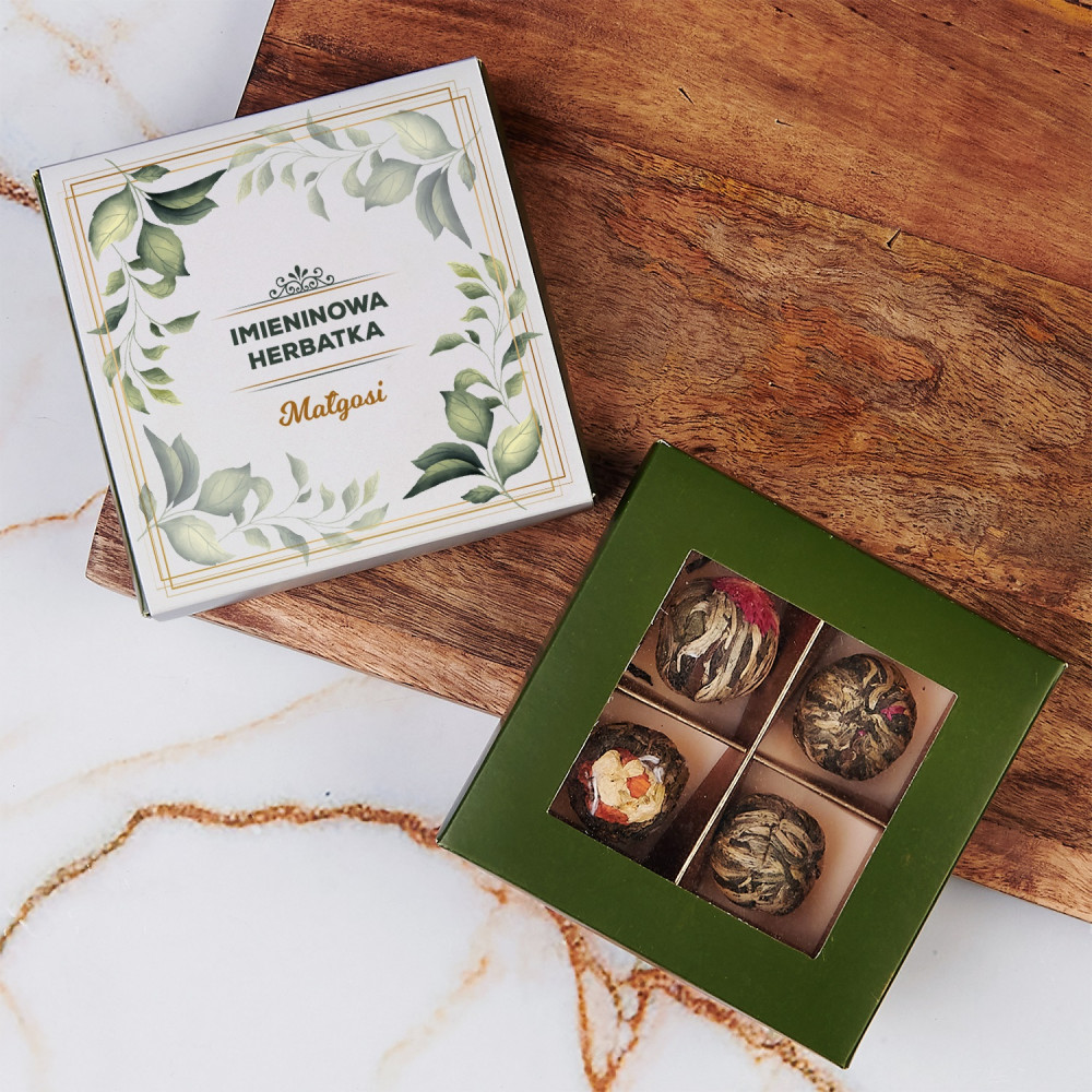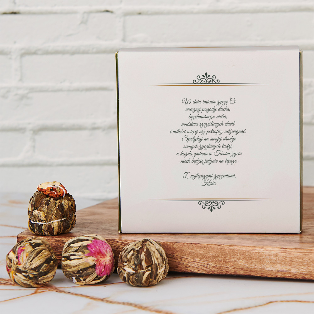 Niezwykła kompozycja czterech herbat kwitnących to piękny podarunek, który zachwyci obdarowaną osobę. Niepowtarzalna grafika na obwolucie prezentowej, którą wcześniej spersonalizujesz, z pewnością sprawi ogromną radość, ale to nie koniec niespodzianek. Tajemnicze, kwiatowe kule zaintrygują, ale prawdziwa magia pojawi się w trakcie zaparzania. Herbata rozkwitnie, prezentując fantazyjne kształty i kolory. Obserwowanie takiego kwitnącego przedstawienia jest niezwykle przyjemne. Później zostaje już tylko cieszyć się smakiem i aromatem pysznej herbaty. Tak oryginalny i pięknie zapakowany upominek będzie pasował na wiele okazji!Smaki herbat:
