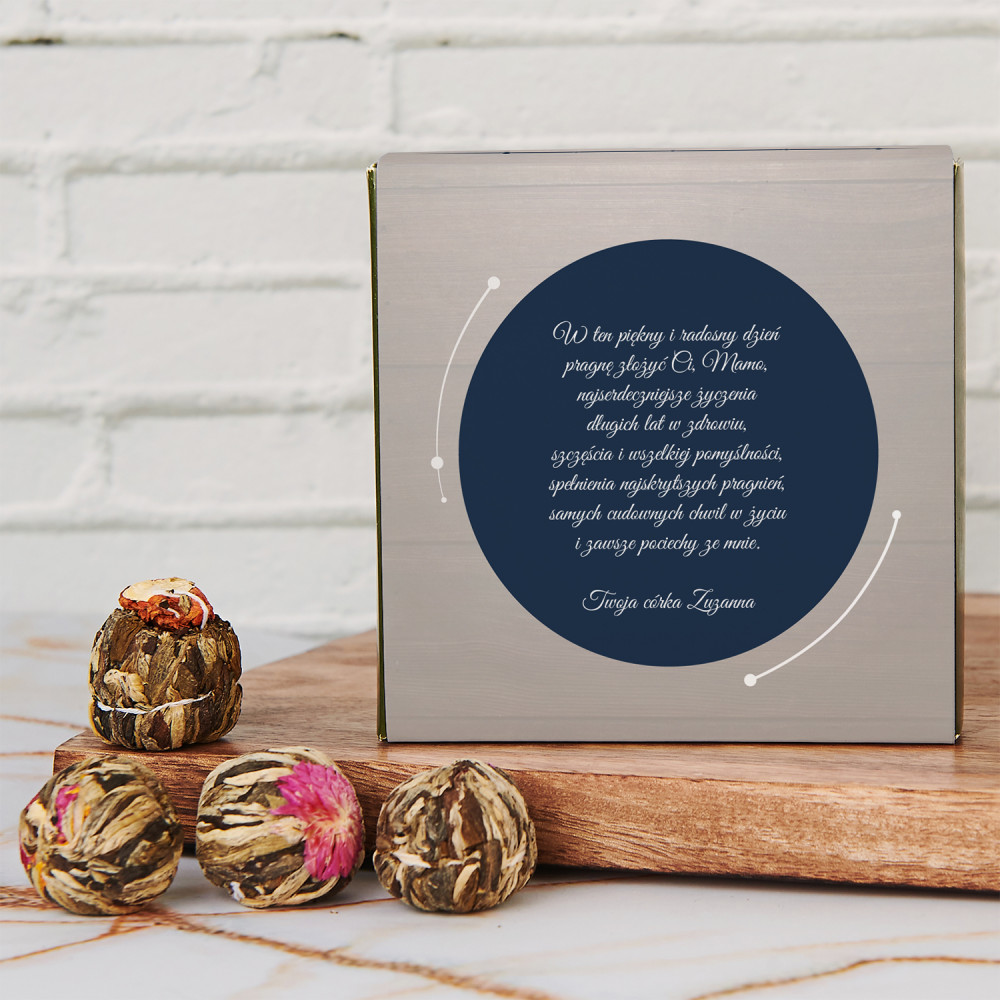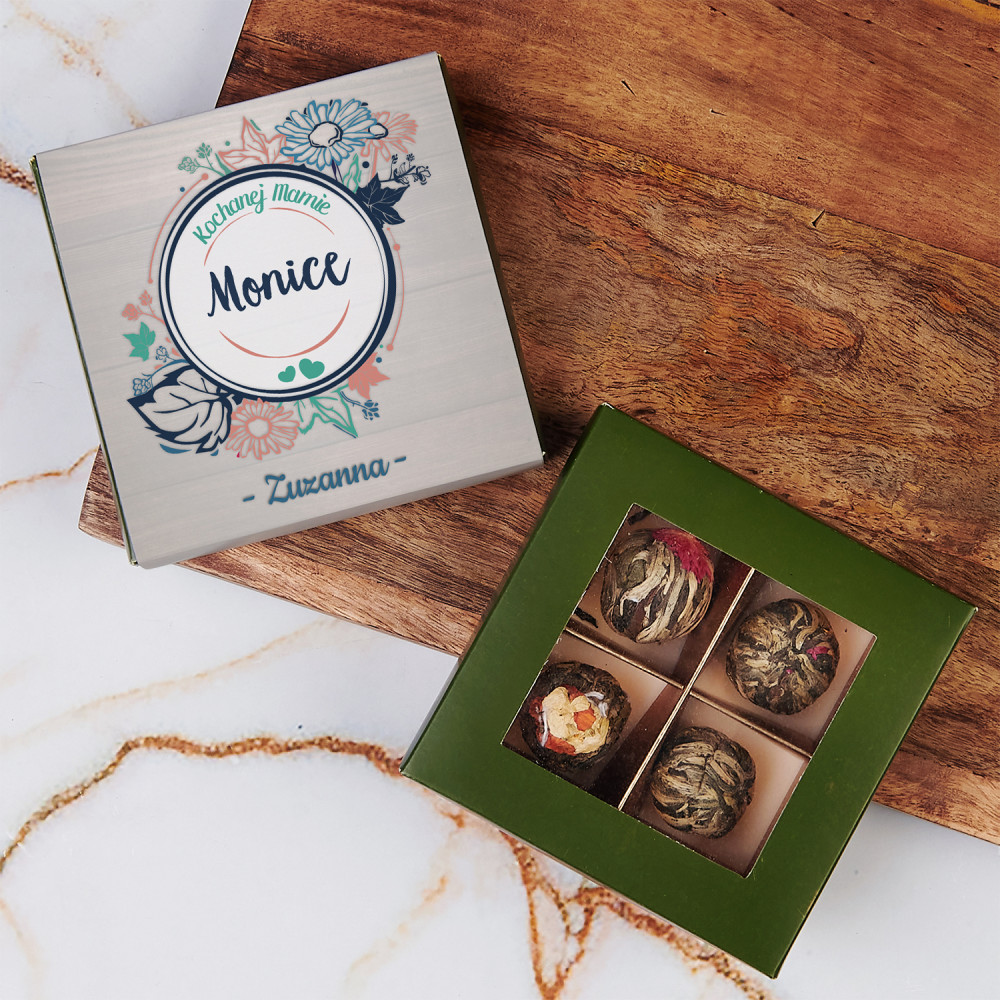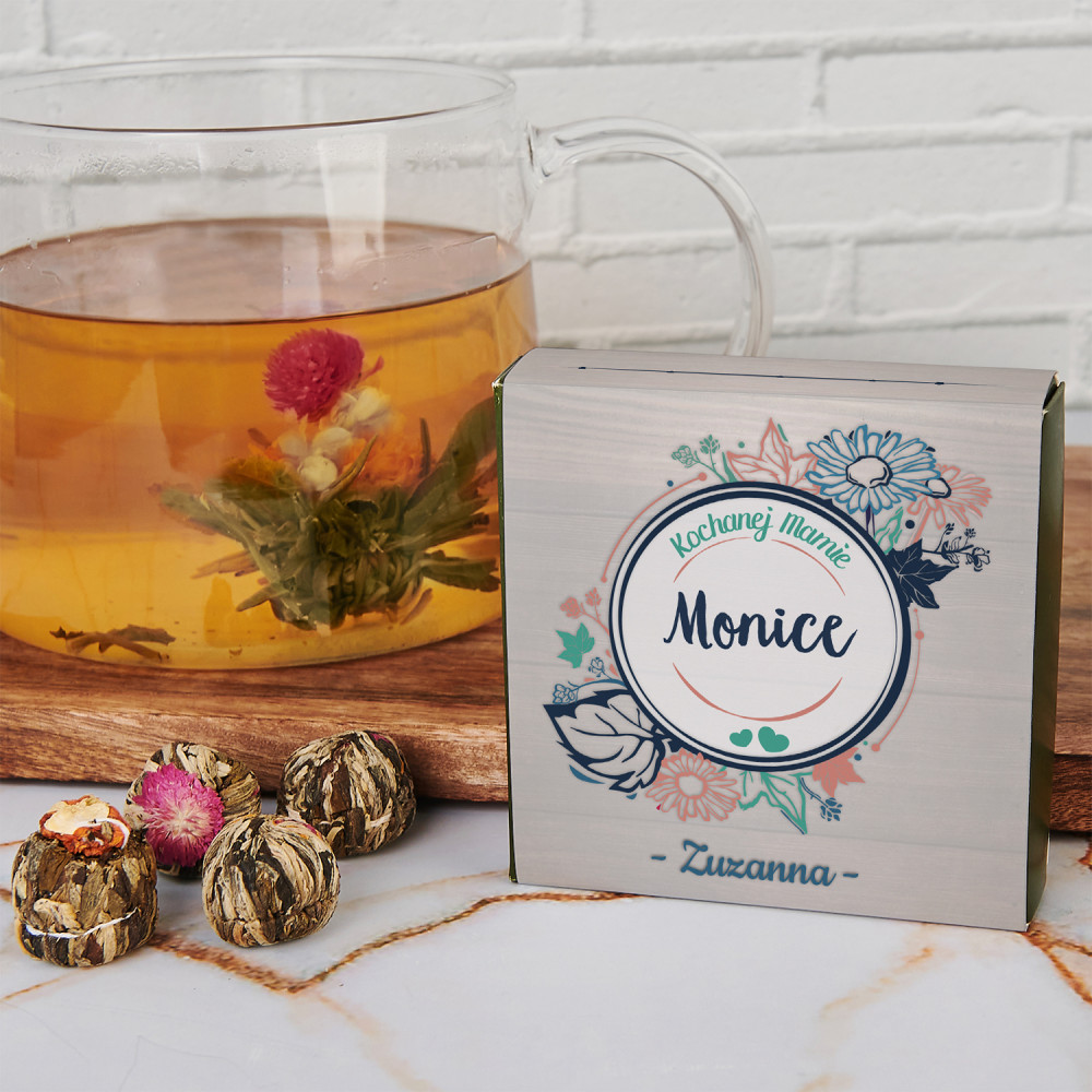 Niezwykła kompozycja czterech herbat kwitnących to piękny podarunek, który zachwyci obdarowaną osobę. Niepowtarzalna grafika na obwolucie prezentowej, którą wcześniej spersonalizujesz, z pewnością sprawi ogromną radość, ale to nie koniec niespodzianek. Tajemnicze, kwiatowe kule zaintrygują, ale prawdziwa magia pojawi się w trakcie zaparzania. Herbata rozkwitnie, prezentując fantazyjne kształty i kolory. Obserwowanie takiego kwitnącego przedstawienia jest niezwykle przyjemne. Później zostaje już tylko cieszyć się smakiem i aromatem pysznej herbaty. Tak oryginalny i pięknie zapakowany upominek będzie pasował na wiele okazji!Smaki herbat: