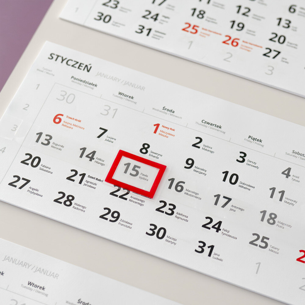 Trójdzielny kalendarz z wybraną personalizacją.