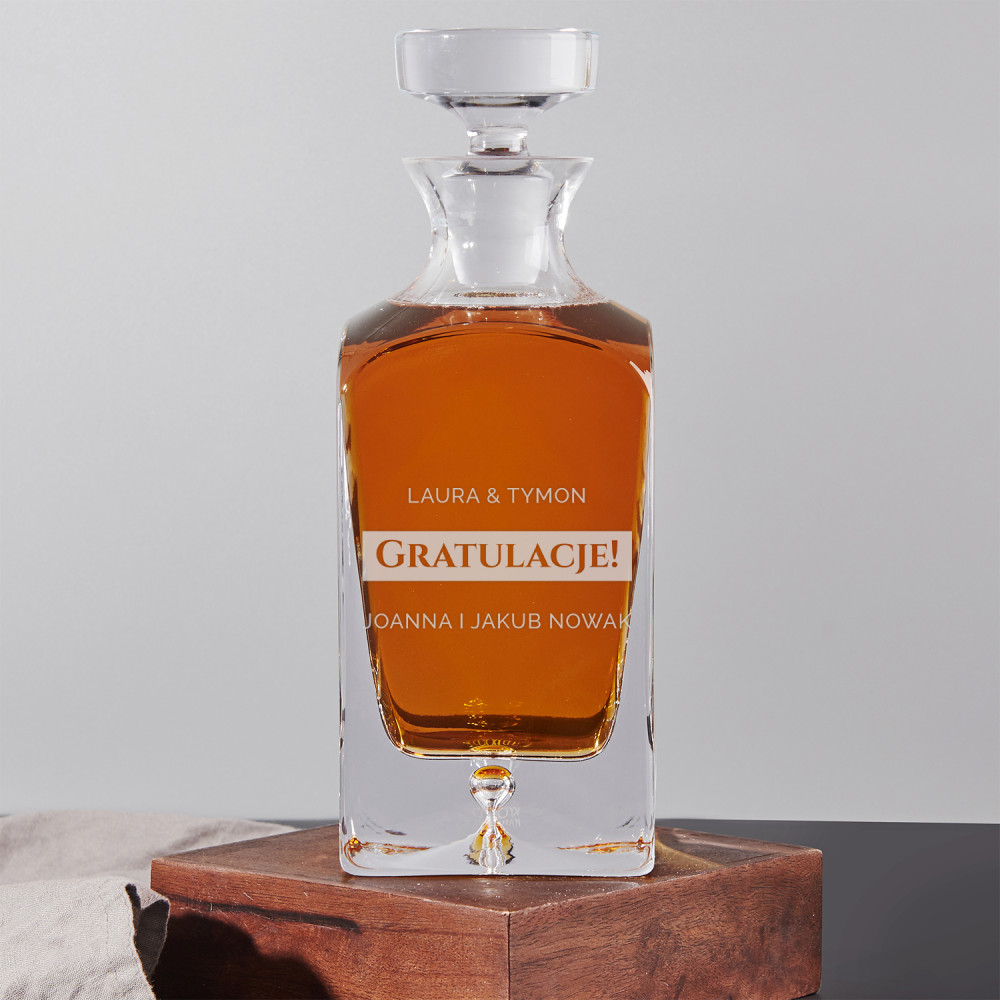 Wysokiej jakości karafka z przezroczystego szkła to nie tylko praktyczny dodatek, ale również wspaniała dekoracja stołu i prezent, który pasuje na wiele ważnych okazji. W takiej karafce można zaserwować whisky, nalewkę lub inny ulubiony trunek. Prosta forma i eleganckie styl sprawiają, że produkt będzie pasował zarówno do weekendowych spotkań z najbliższymi, jak i do uroczystych przyjęć. Kwadratowy kształt załamuje światło, które pięknie wydobywa barwę trunku, a na spodzie jest zatopiony efektowny pęcherzyk powietrza. Na powierzchni karafki umieszczamy personalizowany grawer, który dodaje upominkowi wyjątkowego charakteru.Pojemność: 750 ml