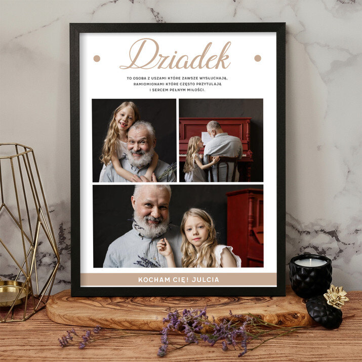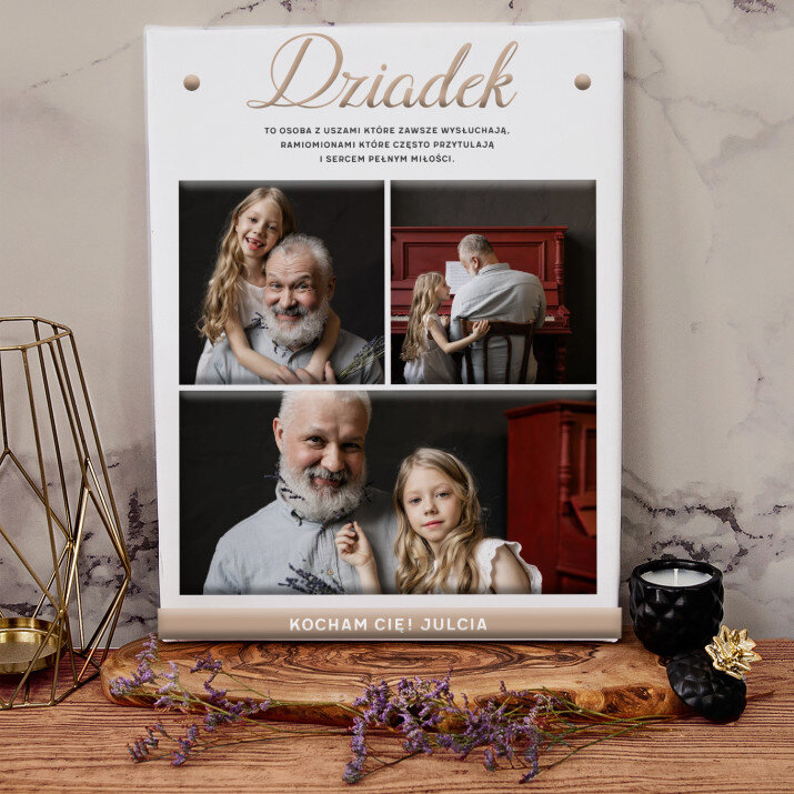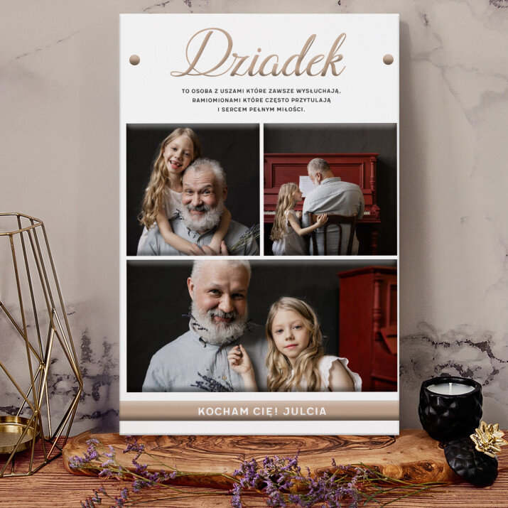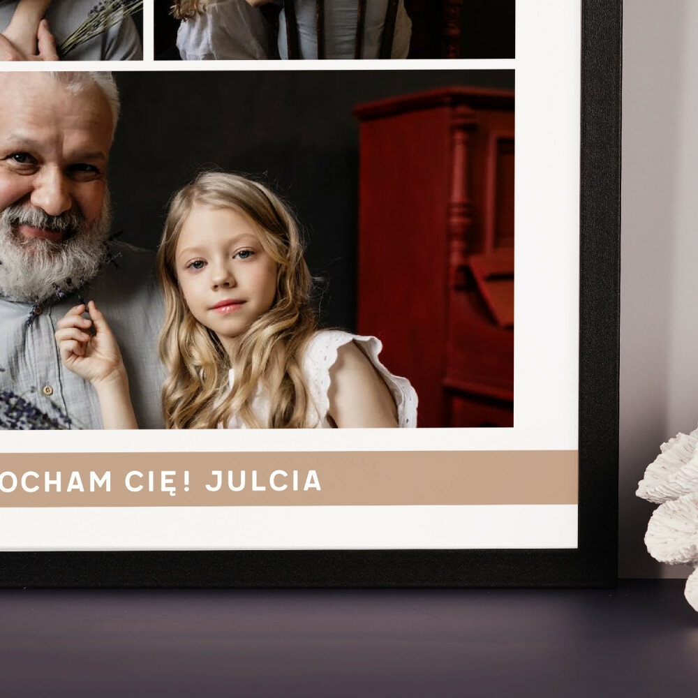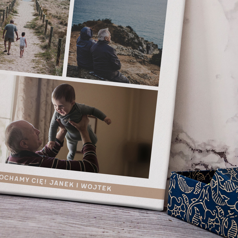 Piękna kompozycja Twoich zdjęć z kilkoma słowami prosto z serca oraz podpisami. Idealny prezent dla tych, z którymi łączy Cię mnóstwo wspomnień. Wystarczy wybrać ulubione fotografie najważniejszych dla Was chwil, a powstanie pamiątka, która zostanie z obdarowaną osobą na zawsze. To również niezwykle oryginalna i efektowna dekoracja do mieszkania.