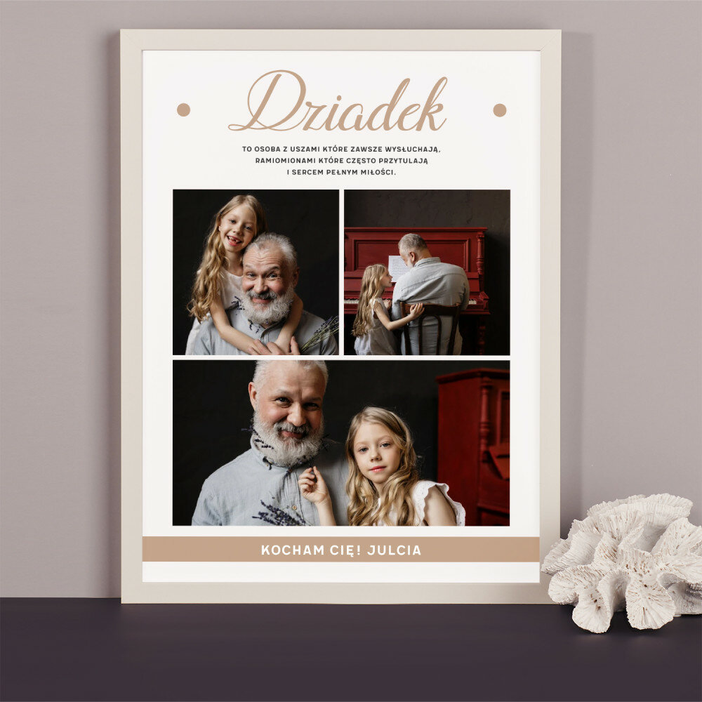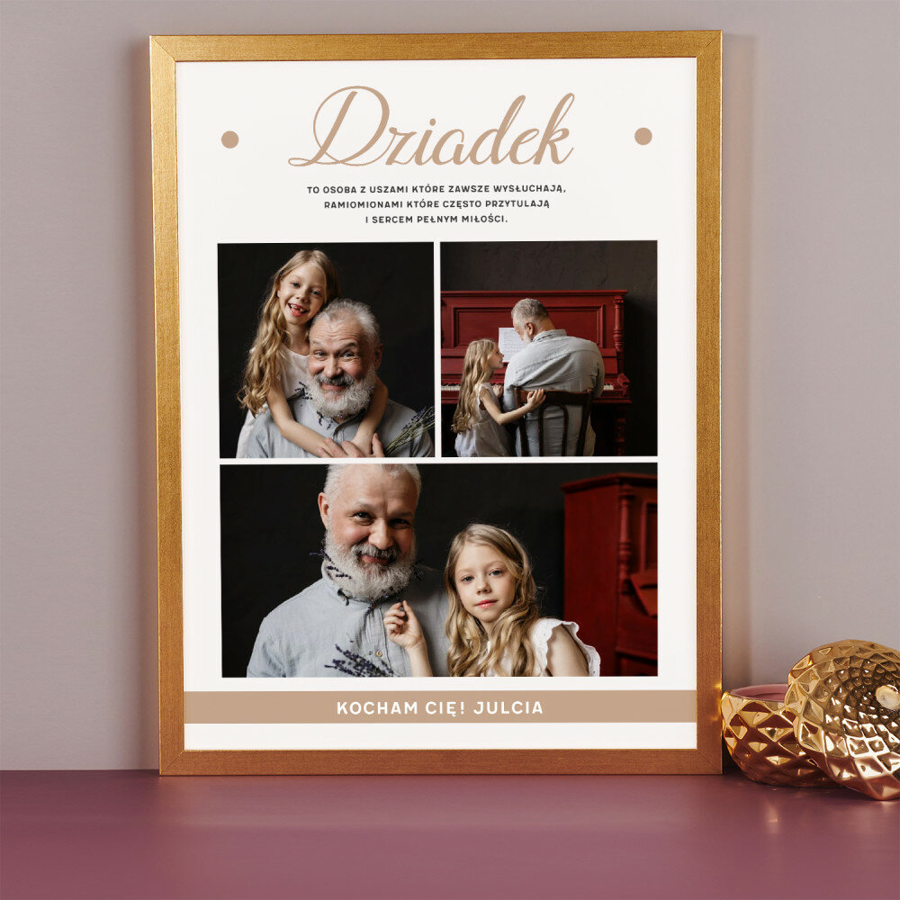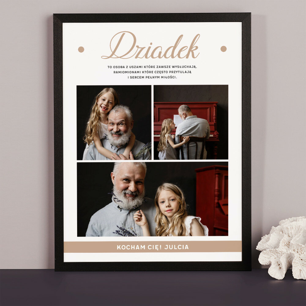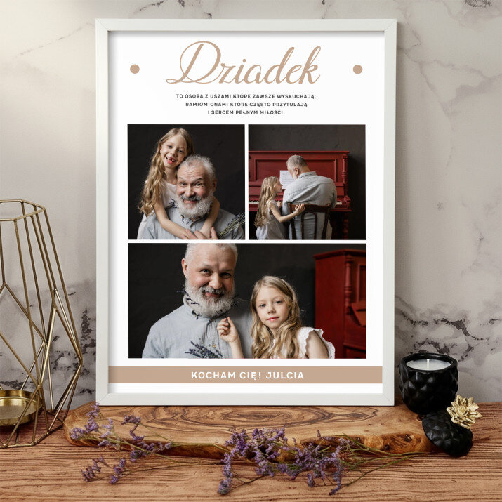 Piękna kompozycja Twoich zdjęć z kilkoma słowami prosto z serca oraz podpisami. Idealny prezent dla tych, z którymi łączy Cię mnóstwo wspomnień. Wystarczy wybrać ulubione fotografie najważniejszych dla Was chwil, a powstanie pamiątka, która zostanie z obdarowaną osobą na zawsze. To również niezwykle oryginalna i efektowna dekoracja do mieszkania.