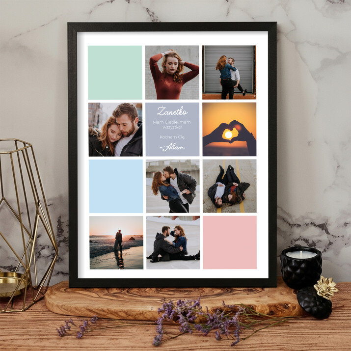 Piękna kompozycja Twoich zdjęć z kilkoma słowami prosto z serca oraz podpisami. Idealny prezent dla tych, z którymi łączy Cię mnóstwo wspomnień. Wystarczy wybrać ulubione fotografie najważniejszych dla Was chwil, a powstanie pamiątka, która zostanie z obdarowaną osobą na zawsze. To również niezwykle oryginalna i efektowna dekoracja do mieszkania.WYKONANIE