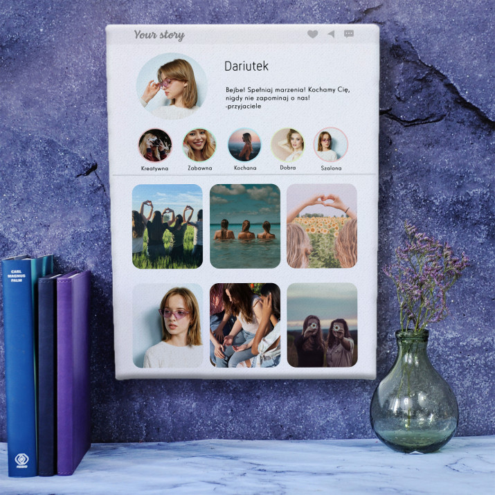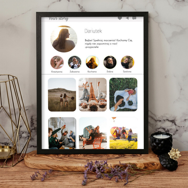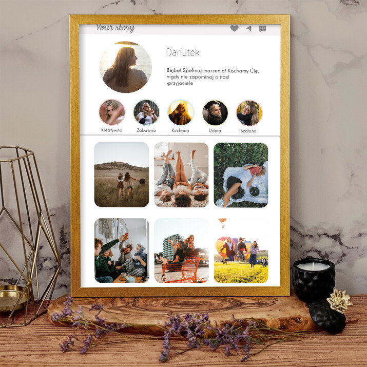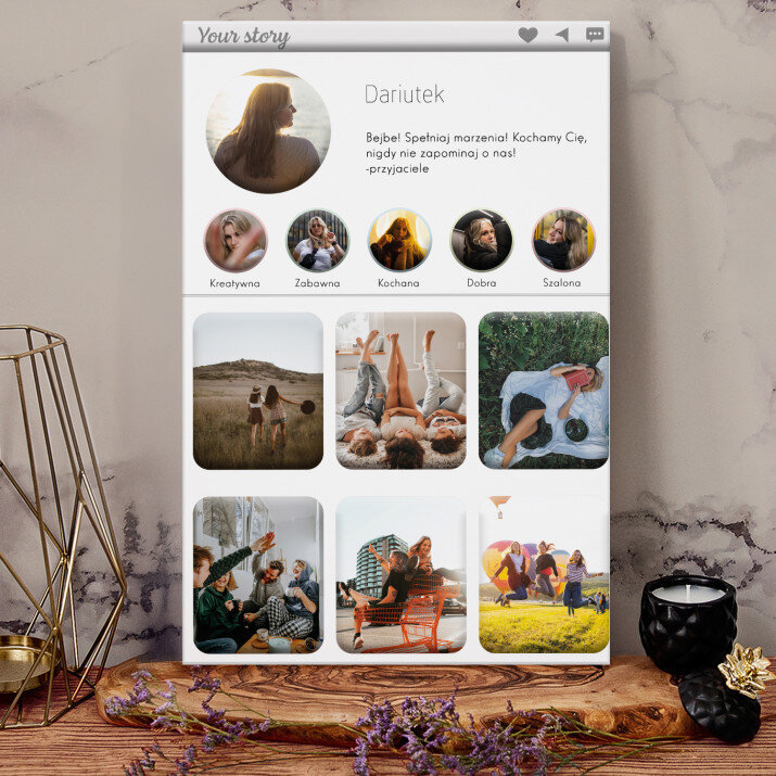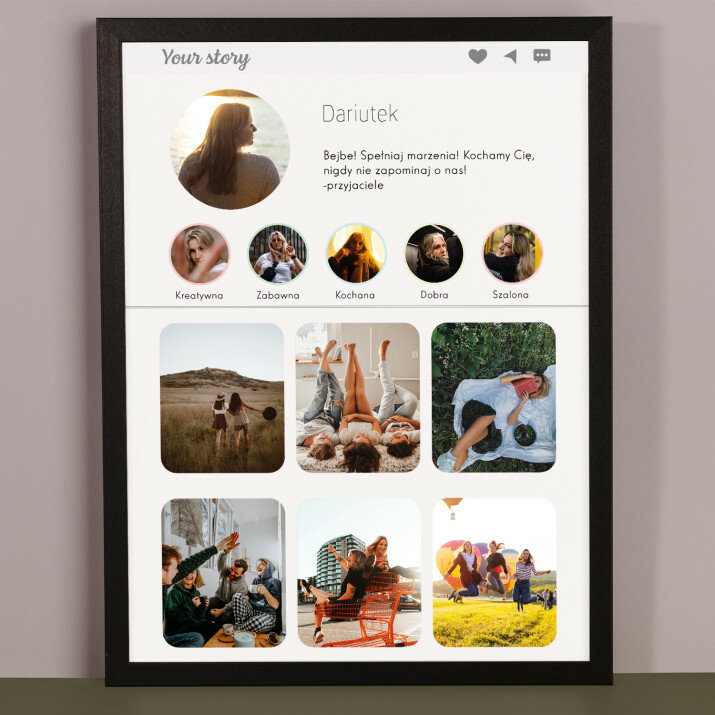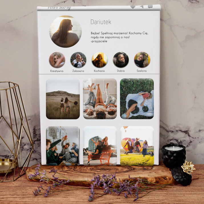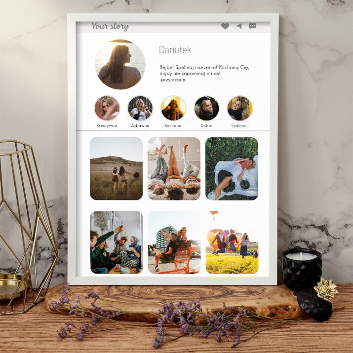 Piękna kompozycja Twoich zdjęć z kilkoma słowami prosto z serca oraz podpisami. Idealny prezent dla tych, z którymi łączy Cię mnóstwo wspomnień. Wystarczy wybrać ulubione fotografie najważniejszych dla Was chwil, a powstanie pamiątka, która zostanie z obdarowaną osobą na zawsze. To również niezwykle oryginalna i efektowna dekoracja do mieszkania.WYKONANIE