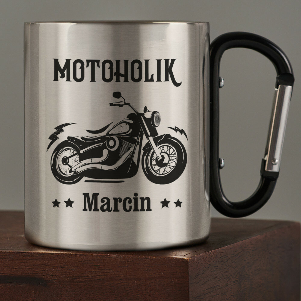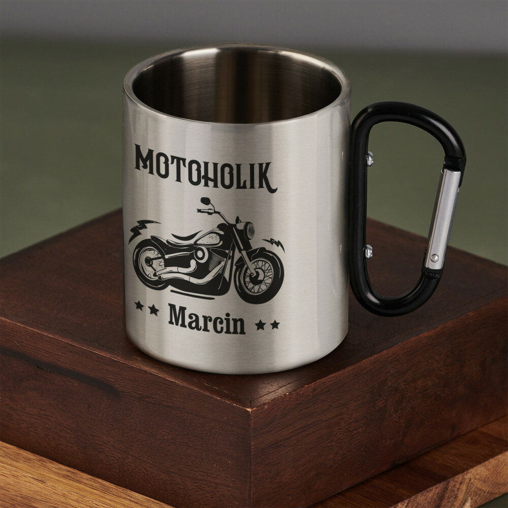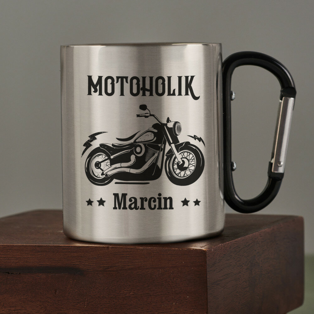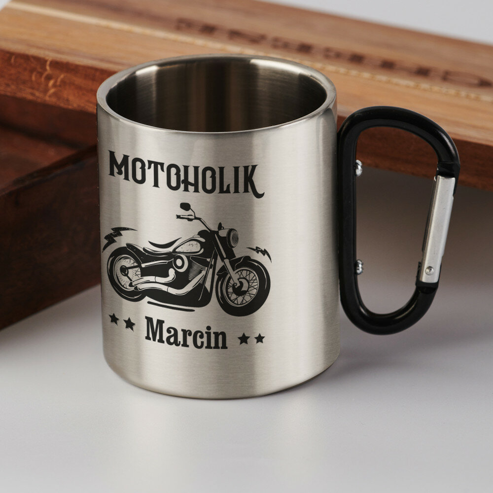 Błyszczący, stalowy kubek z podwójnymi ściankami i kolorowym nadrukiem. Wysoka jakość wykonania oraz eleganckie wykończenie sprawiają, że świetnie sprawdzi się zarówno w podróży, jak i w domowym zaciszu. Przetrwa trudne warunki i zawsze będzie wyglądał doskonale! Kubek ma czarne, stalowe ucho, które jest jednocześnie karabińczykiem umożliwiającym przypięcie kubka np. do plecaka.Wymiary: pojemność ok. 300 ml, średnica 7,5 cm, wysokość 9 cm.