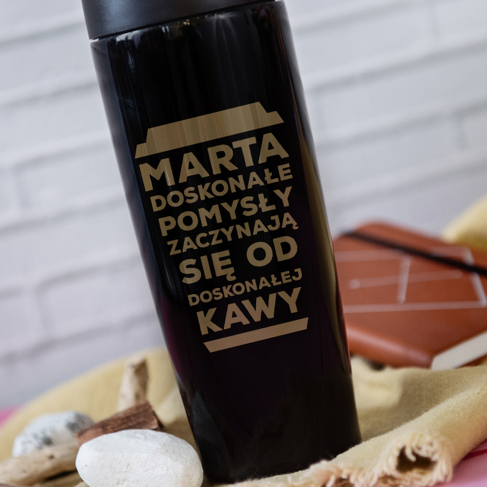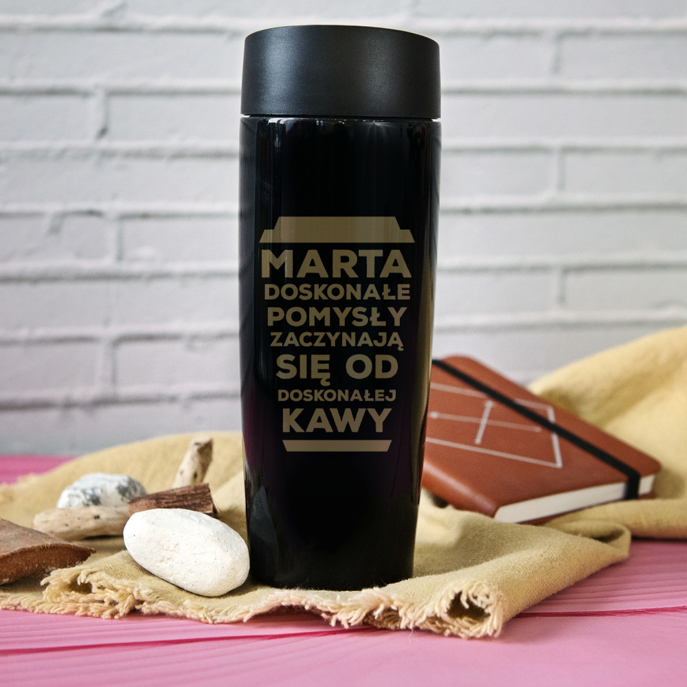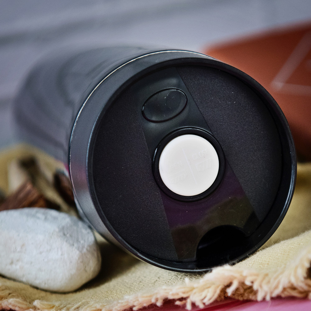 Kubek termiczny o pojemności 320ml i wymiarach 19,2 x 7,2 cm.Wewnątrz wykończony dwiema ściankami ze stali nierdzewnej oddzielonymi od siebie próżnią. Z zewnątrz metaliczne wykończenie w kolorze czarnym ze spersonalizowanym grawerem. Kubek posiada plastikową pokrywkę, która szczelnie chroni przed wylewaniem się napoju. Pokrywka posiada funkcje push open/close, dzięki czemu nie wymaga obsługi oburącz. Kubków termicznych nie należy myć w zmywarkach.