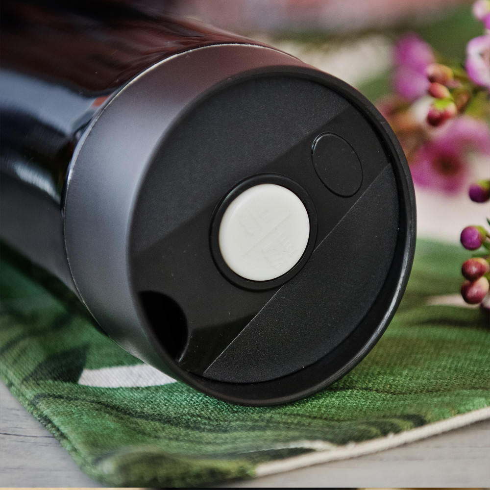 Kubek termiczny o pojemności 320ml i wymiarach 19,2 x 7,2 cm.Wewnątrz wykończony dwiema ściankami ze stali nierdzewnej oddzielonymi od siebie próżnią. Z zewnątrz metaliczne wykończenie w kolorze czarnym ze spersonalizowanym grawerem. Kubek posiada plastikową pokrywkę, która szczelnie chroni przed wylewaniem się napoju. Pokrywka posiada funkcje push open/close, dzięki czemu nie wymaga obsługi oburącz. Kubków termicznych nie należy myć w zmywarkach.
