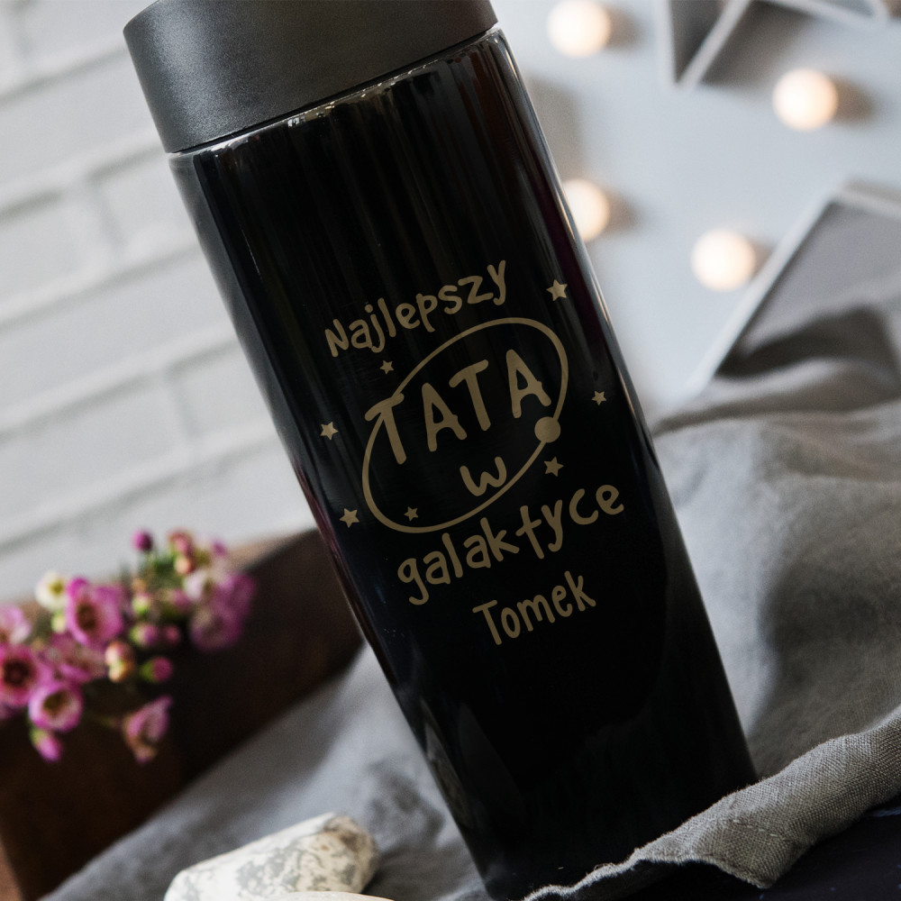 Kubek termiczny o pojemności 320ml i wymiarach 19,2 x 7,2 cm.Wewnątrz wykończony dwiema ściankami ze stali nierdzewnej oddzielonymi od siebie próżnią. Z zewnątrz metaliczne wykończenie w kolorze czarnym ze spersonalizowanym grawerem. Kubek posiada plastikową pokrywkę, która szczelnie chroni przed wylewaniem się napoju. Pokrywka posiada funkcje push open/close, dzięki czemu nie wymaga obsługi oburącz. Kubków termicznych nie należy myć w zmywarkach.