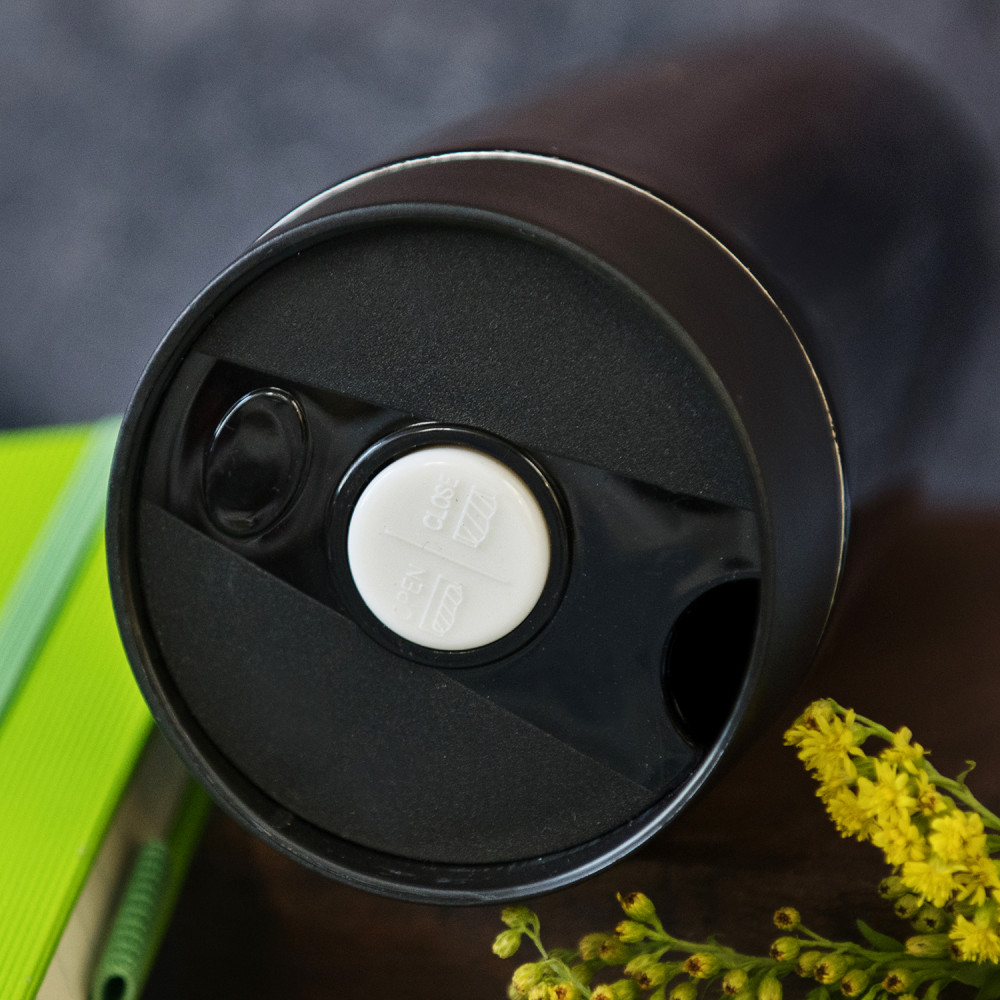 Kubek termiczny o pojemności 320ml i wymiarach 19,2 x 7,2 cm.Wewnątrz wykończony dwiema ściankami ze stali nierdzewnej oddzielonymi od siebie próżnią. Z zewnątrz metaliczne wykończenie w kolorze czarnym ze spersonalizowanym grawerem. Kubek posiada plastikową pokrywkę, która szczelnie chroni przed wylewaniem się napoju. Pokrywka posiada funkcje push open/close, dzięki czemu nie wymaga obsługi oburącz. Kubków termicznych nie należy myć w zmywarkach.