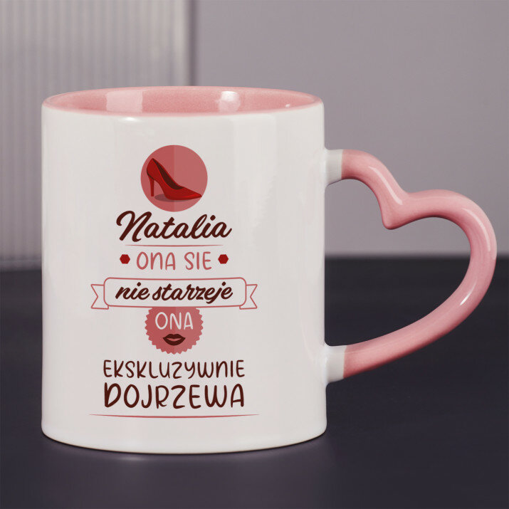 Dostępne są również kubki z uszkiem w kształcie serca i różowym środkiem, o pojemności 330 ml