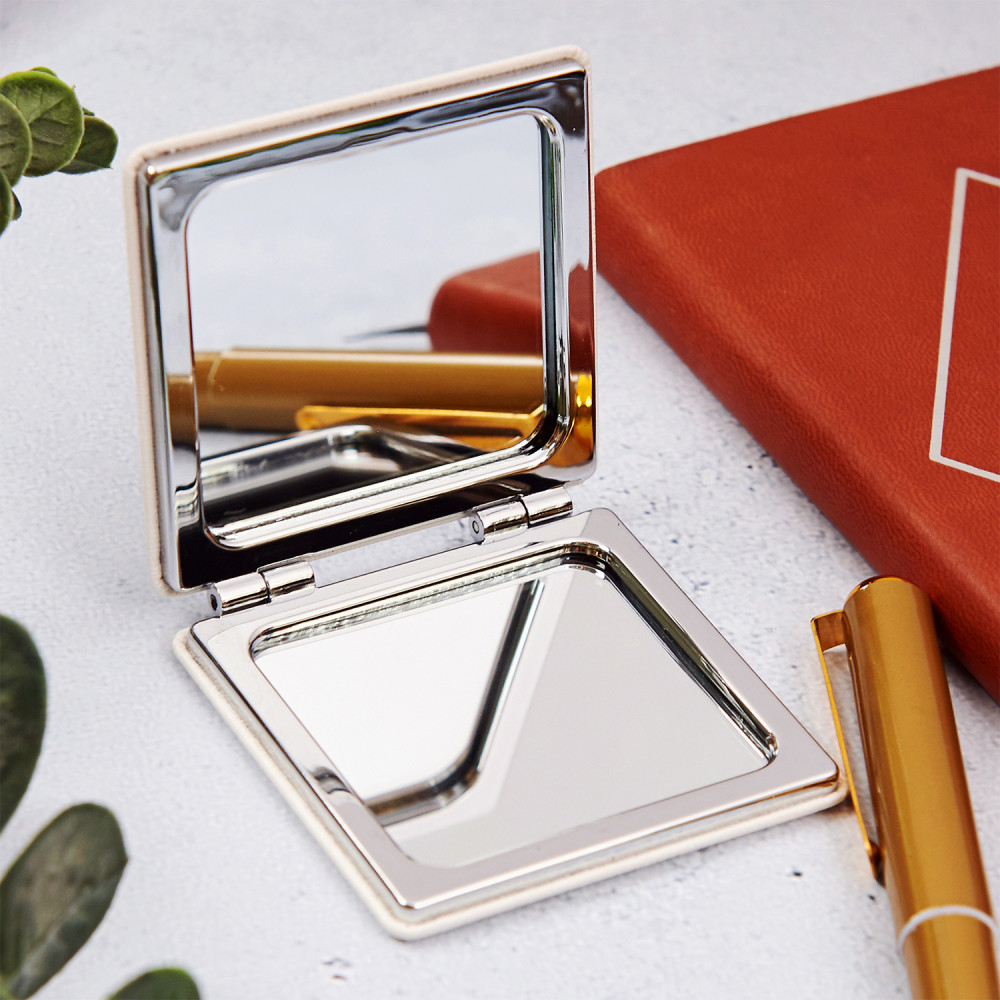 Kieszonkowe, nietłukące się lusterko wykonane z polerowanego metalu, pokryte ekologiczną skórą w kolorze białym. Lusterko jest zarówno standardowe, jak i powiększające, co zapewnia wygodę użytkowania w każdych warunkach. Elegancki, ponadczasowy design trafi w każdy gust. To obowiązkowy element wyposażenia damskiej torebki.